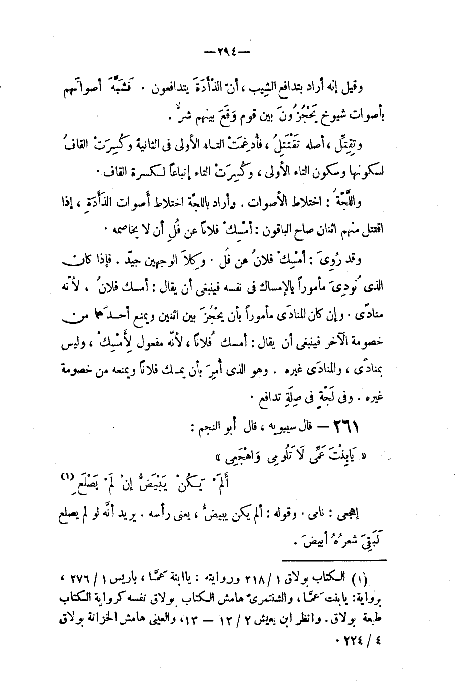 و (تقتل) أصله تقتتل، فأدغمت التاء الأولى في الثانية، وكسرت القاف لسكونها وسكون التاء الأولى، وكسرت التاء اتباعا لكسرة القاف. واللجة: اختلاط الأصوات، وأراد باللجة اختلاط أصوات الذادة؛ إذا اقتتل منهم اثنان صاح الباقون: أمسك فلانا عن فل أن لا يخاصمه.