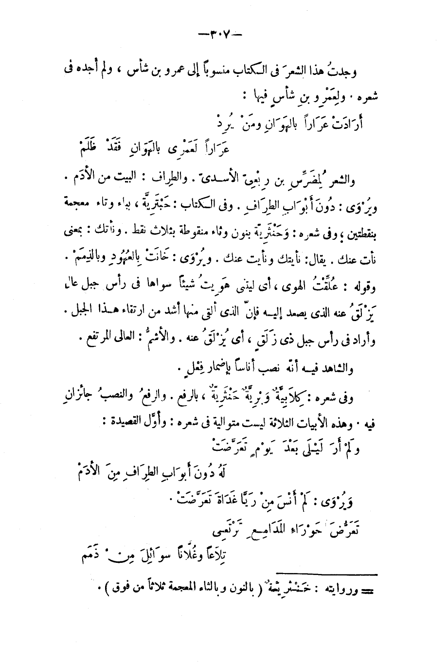 والشاهد فيه إنه نصب (أناسا) بإضمار فعل. وفي شعره: (كلابية) وبرية (حنثرية) بالرفع، والرفع والنصب جائزان فيه، وهذه الأبيات الثلاثة ليست متوالية في شعره. وأول القصيدة: