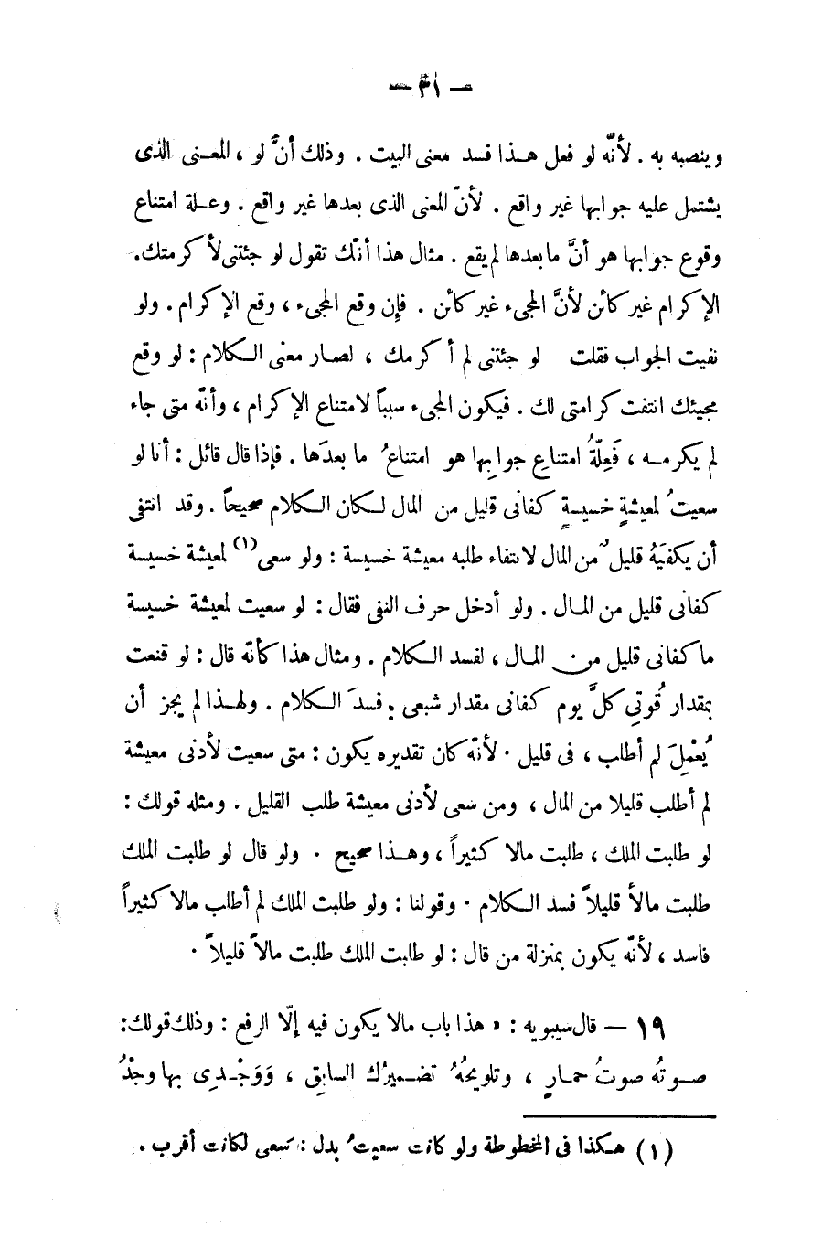 فإذا قال قائل: أنا لو سعيت لمعيشة خسيسة كفاني قليل من المال؛ لكان الكلام صحيحا، وقد انتفى أن يكفيه قليل من المال لانتفاء طلبه معيشة خسيسة، ولو سعى لمعيشة خسيسة كفاه قليل من المال. ولو ادخل حرف النفي فقال: لو سعيت لمعيشة خسيسة ما كفاني قليل من المال لفسد الكلام. ومثال هذا كأنه قال: لو قنعت بمقدار قوتي كل يوم كفاني مقدار شبعي. (وهذا سديد من الكلام. وكل هاة إنه لا يكفيه مقدار شبعه ولا يقتنع بقوته في كل يوم.