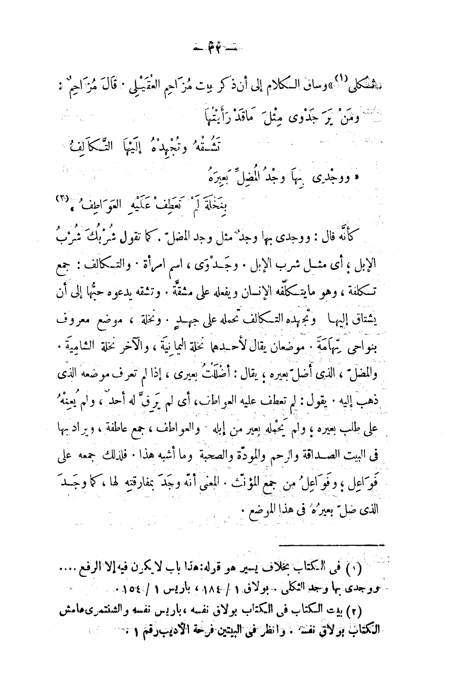 وجدوى: اسم امرأة، والتكالف: جمع تكلفة وهو ما يتكلفه الإنسان ويفعله على مشقة، وتشقه: يدعوه حبها إلى أن يشتاق إليها، وتجهده التكالف: تحمله على جهد، ونخلة: موضع معروف بنواحي تهامة موضعان: يقال لأحدهما نخلة اليمانية، والآخر نخلة الشامية، والمضل: الذي أضل بعيره. قال: أضللت بعيري، إذ لم تعرف موضعه الذي ذهب إليه. يقول: لم تعطف من إبله. والعواطف: جمع عاطفة، ويراد بها في البيت الصداقة والرحم والمودة والصحبة وما أشبه هذا، فلذلك جمعه على فواعل، وفواعل من جمع المؤنث. المعنى إنه وجد بمفارقته لها، كما وجد الذي ضل بعيره في هذا الموضع.