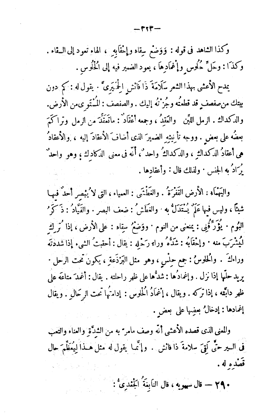 ووجه تأنيثه الضمير الذي أضاف الاعقاد اله - والاعقاد هي اعقاد الدكداك، والدكداك واحد - إنه في معنى الدكادك، وهو واحد يراد به الجنس، ولذلك قال: واعقادها. واليهماء: الأرض القفرة، والغطشى: العمياء التي لا يبصر أحد فيها شيئا، وليس فيها علم يستدل به، والغطش: ضعف البصر، والفياد: ذكر البوم، يؤرقني: يمنعني من النوم.
