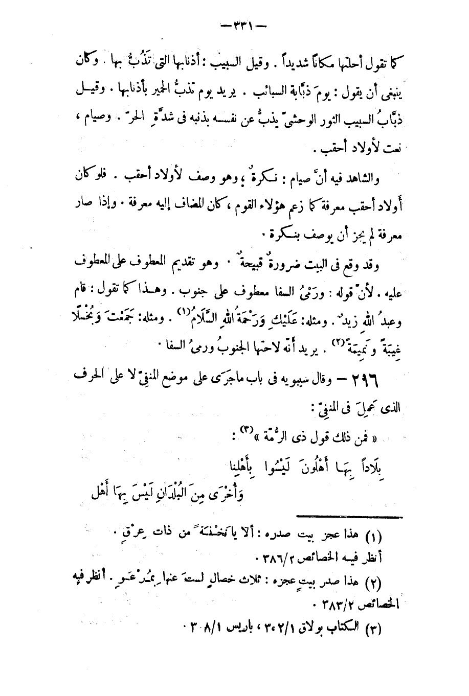 قال سيبويه في باب: ما جرى على موضع المنفي لا على الحرف الذي عمل في المنفى. فمن ذلك قول ذي الرمة: