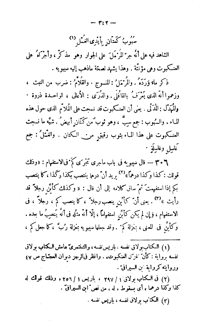 ذكر ماء ورده، والمرمل: المنسوج، والفلام: ضرب من النبت، وزعموا إنه الذي يعرف بالقاقلي، والذرى: الأعالي الواحدة ذروة، والمهدل: المدلى. يعني أن العنكبوت قد نسجت على القلام الذي حول هذا الماء، والسبوب: جمع سب وهو ثوب من كتان ابيض. شبه ما نسجت العنكبوت على هذا الماء بثوب رقيق من الكتان، والغسل: جمع غاسل وغاسلة.