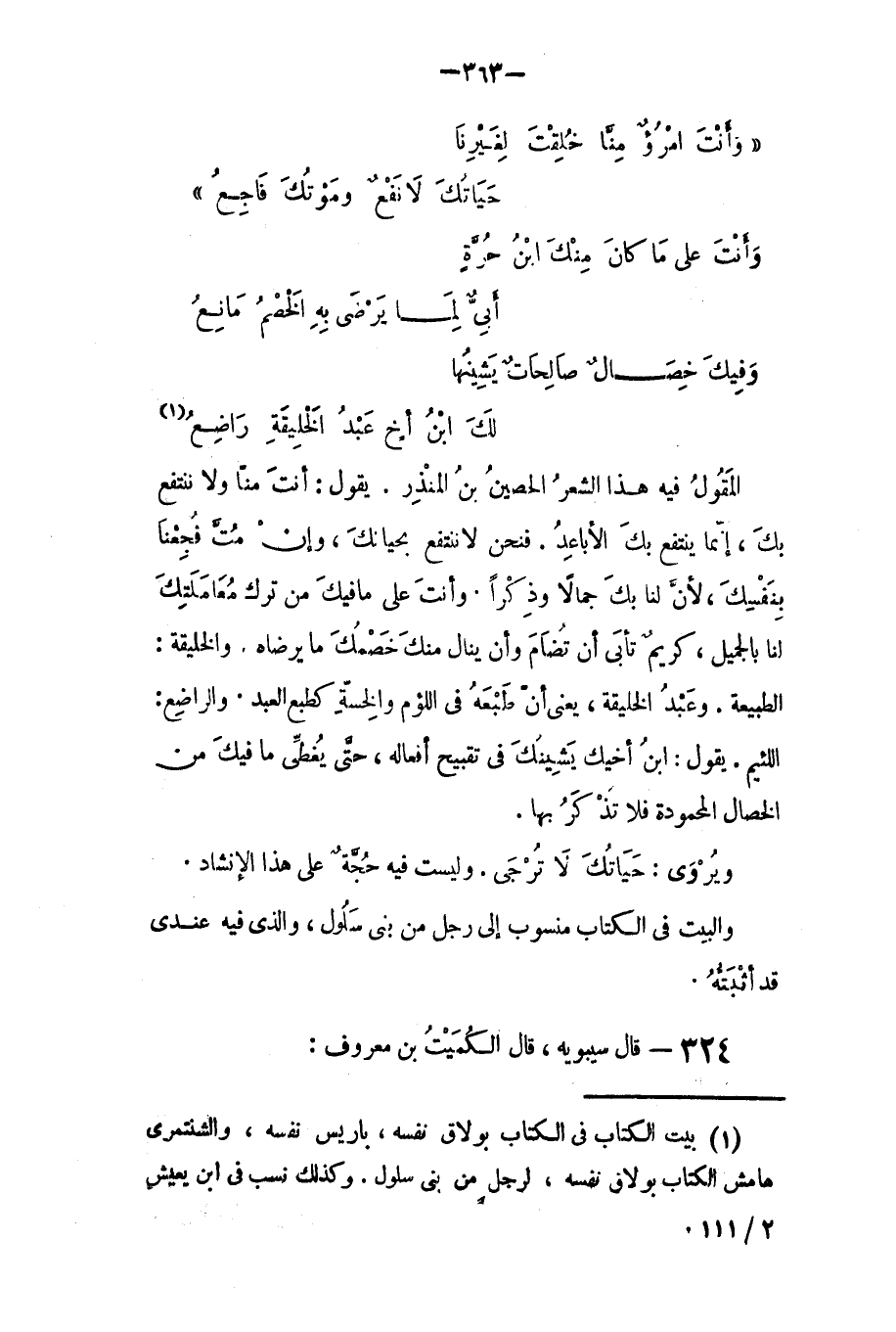المقول فيه هذا الشعر: الحضين بن المنذر. يقول: أنت منا ولا ننتفع بك، إنما ينتفع بك الأباعد، فنحن لا ننتفع بحياتك وأن مت فجعتنا بنفسك، لأن لنا بك جمالا وذكرا، وأنت - على ما فيك من ترك معاملتك لنا بالجميل - كريم تأبى أن تضام وأن ينال منك خصمك ما يرضاه. والخليقة: الطبيعة، وعبد الخليقة يعني أن طبعه في اللؤم والخسة كطبع العبد، والراضع: اللئم.