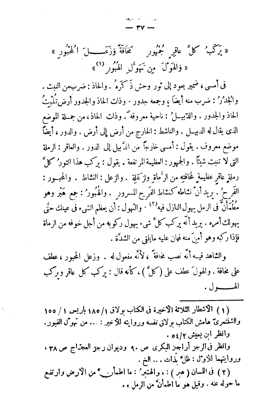 في (أمسى) ضمير يعود إلى ثور وحش ذكره، والحاذ: ضرب من النبت، والجدر: ضرب منه أيضا وجمعه جدور، وذات الحاذ والجدور: أرض تنبت الحاذ والجدور، والدبل: ناحية معروفة، وذات الحاذ: من جملة الموضع الذي يقال له الدبيل، والناشط: الخارج من ارض إلى أرض، والدور أيضا: موضع معروف.