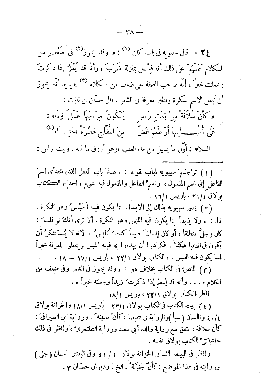 قال السيبويه في باب كان: وقد يجوز في ضعف من الكلام، حملهم على ذلك إنه فعل بمنزلة ضرب، وأنه قد يعلم إذا ذكرت زيدا وجعلته خبرا إنه صاحب الصفة، على ضعف من الكلام.