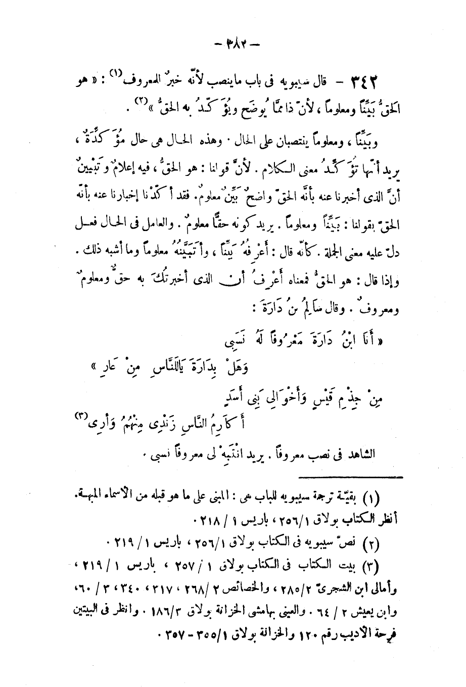 قال سيبويه في باب ما ينتصب لأنه خبر للمعروف: وهو الحق بينا ومعلوما، لأن ذا مما يوضح ويؤكد به الحق، و (بيتا ومعلوما) ينتصبان على الحال، وهذه الحال هي حال مؤكدة. يريد أنها تؤكد معنى الكلام، لأن قولنا (هو الحق) فيه إعلام وتبيين أن الذين أخبرنا عنه بأنه الحق واضح بين معلوم، فقد أكدنا أخبارنا عنه بأنه الحق بقولنا (بيتا ومعلوما) يريد كونه حقا معلوم.
