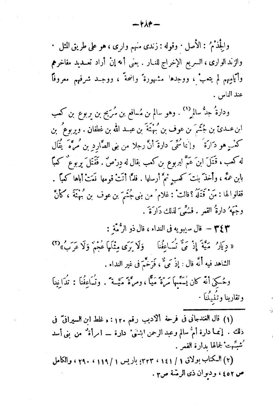 ودارة جد سالم، وهو سالم بن مسافع بن سريح بن يربوع بن كعب ابن عدي بن جشم بن عوف بن بهثة بن عبد الله بن غطفان. ويربوع بن كعب هو دارة، وإنما سمي دارة: أن رجلا من بني الصادر بن مرة يقال له كعب قتل ابن عم ليربوع بن كعب يقال له درص، فقتل يربوع كعبا بابن عمه، واخذ بنت كعب ثم أرسلها. فلما أتت قومها نعت أباها كعبا، فقالوا لها: من قتله؟ قالت: علام من بني جشم بن عوف بن بهثة كأن وجهه دارة القمر. فسمي لذلك دارة.