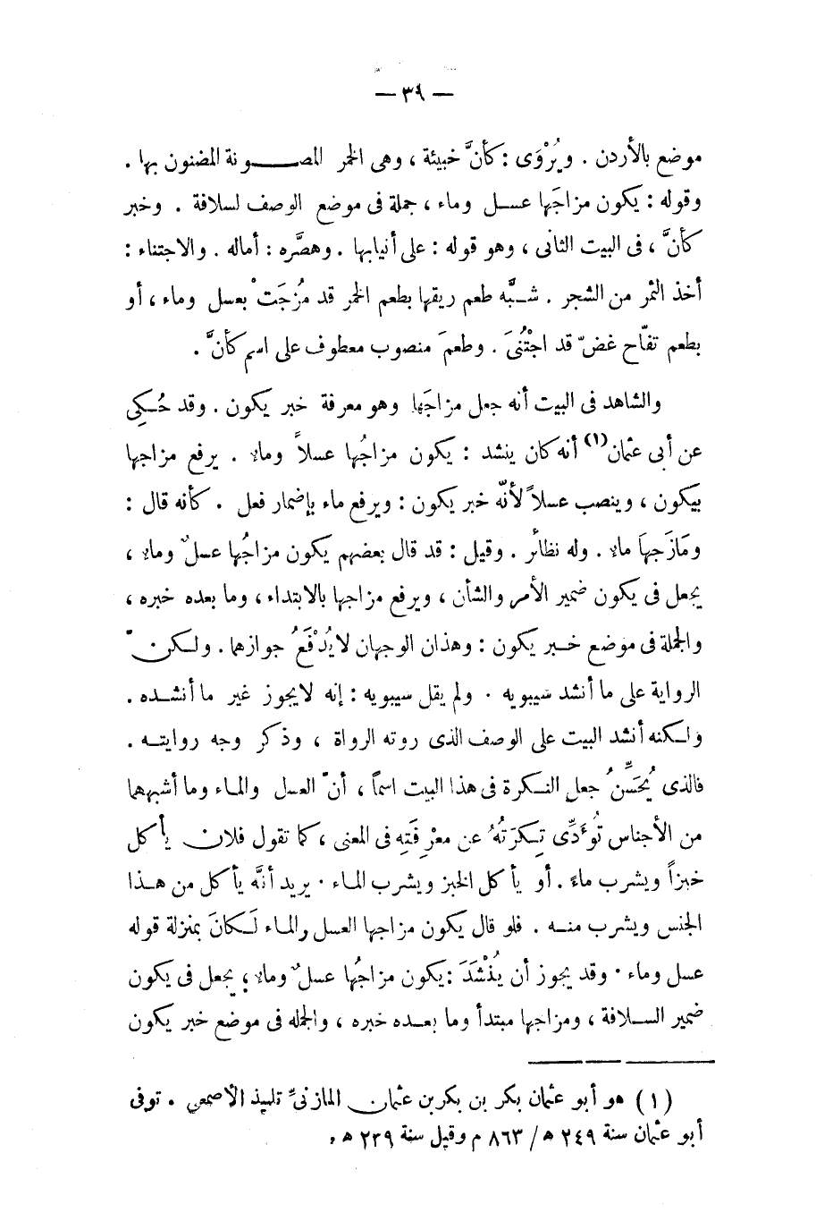 فالذي يحسن جعل النكرة في هذا البيت اسما، أن العسل والماء وما أشبههما من الأجناس تؤدي نكرته عن معرفته في المعنى، كما تقول: فلان يأكل خبزا ويشرب ماء، أو يأكل الخبز ويشرب الماء، يريد إنه يأكل من هذا الجنس ويشرب منه. فلو قال: يكون مزاجها العسل والماء، لكان بمنزلة قوله: عسل وماء.