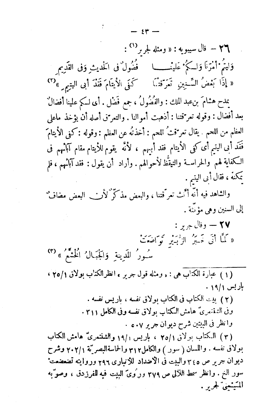 يمدح هشام بن عبد الملك. والفضول: جمع فضل. أي لكم علينا افضال بعد افضال، وقوله تعرقتنا: أذهبت اموالنا، والتعرق: أصله أن يؤخذ ما علي العظم من اللحم، يقال تعرقت اللحم: أخذته عن العظم. وقوله: كفى الأيتام فقد أبي اليتيم؛ أي كفى الأيتام فقد ابيهم، لأنه يقوم للأيتام مقام آبائهم في الكفاية لهم، والحواسة والتيقظ لأحوالهم. وأراد أن يقول: فقد آبائهم فلم يمكنه فقال: أبي اليتيم.