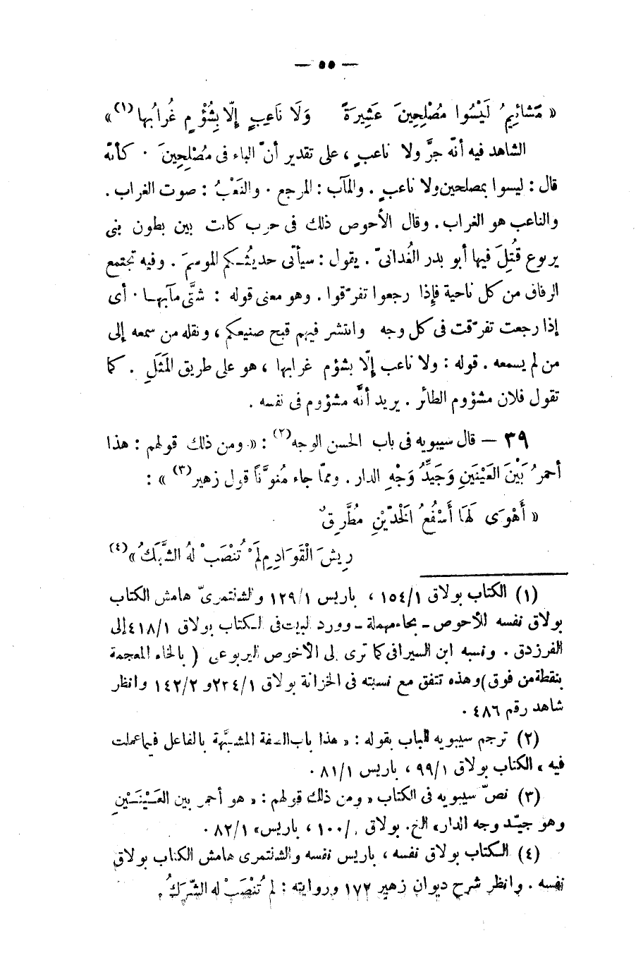 الشاهد فيه إنه جر (ولا ناعب) على تقدير أن الباء في (مصلحين) كأنه قال: ليسوا بمصلحين ولا ناعب. والمآب: المرجع، والنعب: صوت الغراب، والناعب: هو الغراب. يقول: سيأتي حديثكم الموسم، وفيه يجتمع الرفاق من كل ناحية، فإذا رجعوا تفرقوا. وهو معنى قوله: شتى مآبها، أي إذا رجعت تفرقت في كل وجه، وانتشر فيهم قبيح صنيعكم، ونقله من يسمعه إلى من لم يسمعه. قوله: