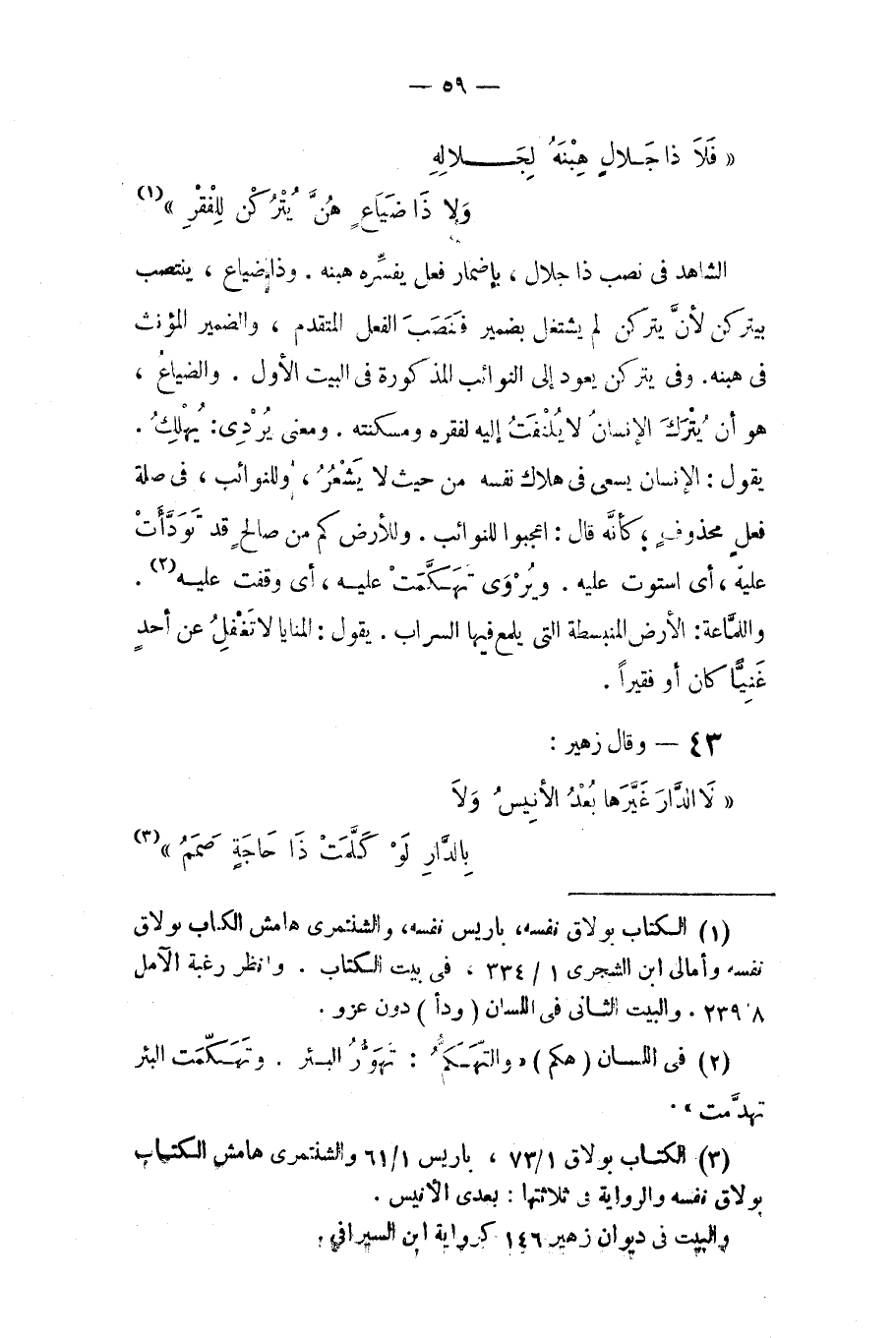 جلال هبنه) و (ذا ضياع) ينتصب بـ (يتركن) لأن (يتركن) لم يشتغل بضمير الاسم المتقدم، والضمير المؤنث في (هبنه) وفي (يتركن) يعود إلى (النوائب) المذكورة في البيت الأول. والضياع: هو أن يترك الإنسان لا يلتفت إليه لفقره ومسكنته.