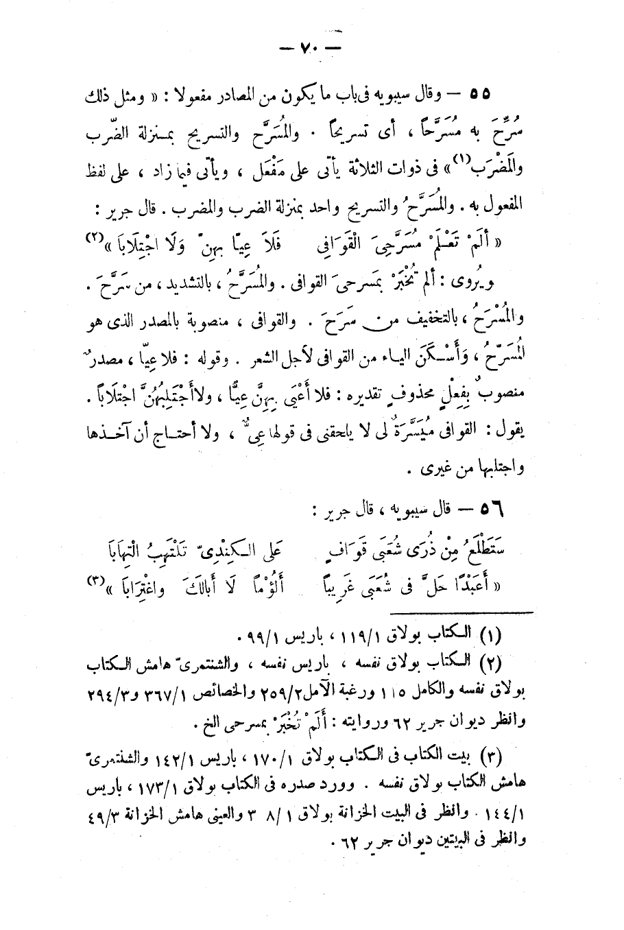وقال سيبويه في باب ما يكون من المصادر مفعولا: ومثل ذلك: سرح به مسرحا أي تسريحا، فالمسرح والتسريح بمنزلة الضرب والمضرب. قال جرير: