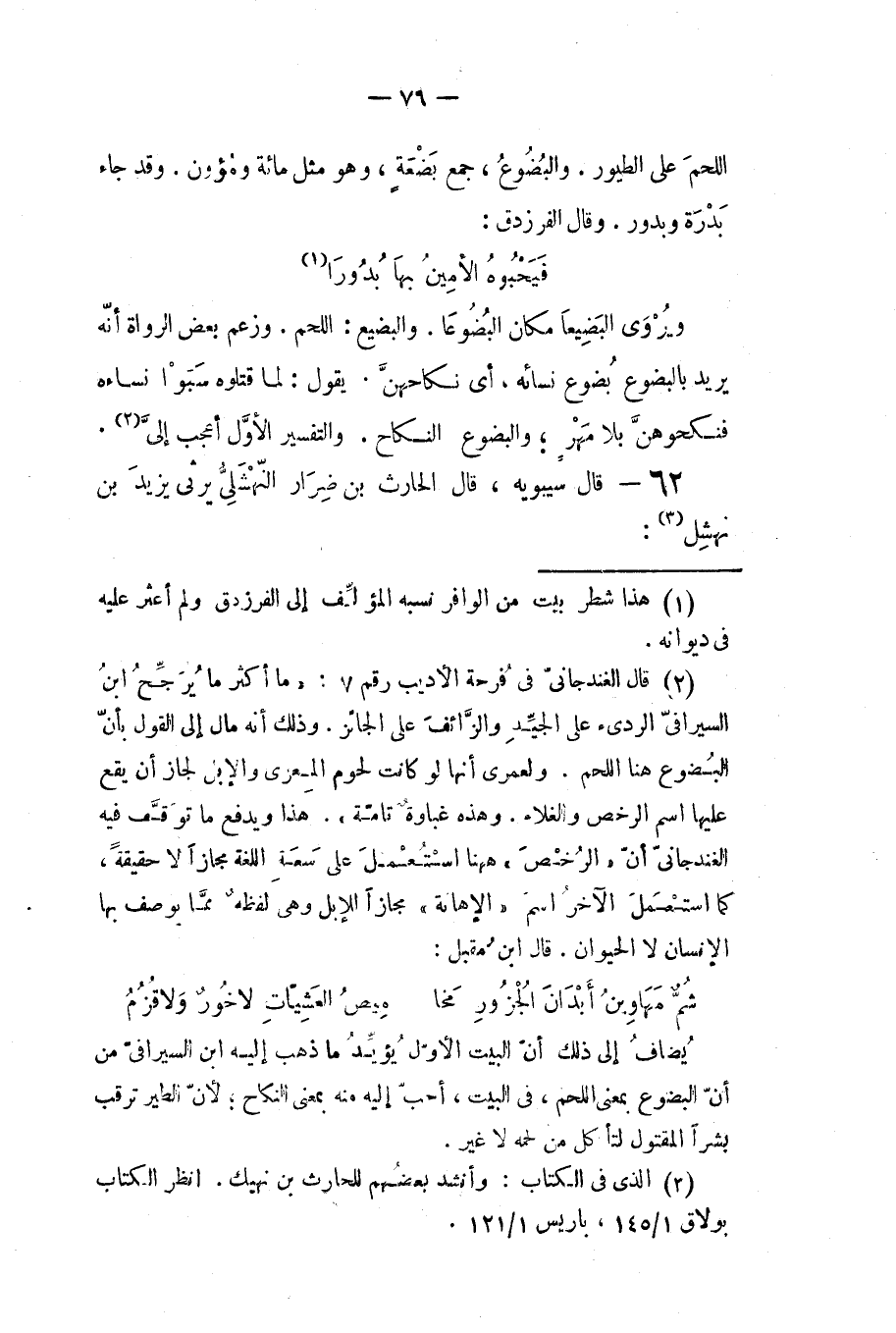ويروى: (البضيعا) مكان (البضوعا). والبضيع: اللحم. وزعم بعض الرواة إنه يريد بالبضوع بضوع نسائه أي نكاحهن.