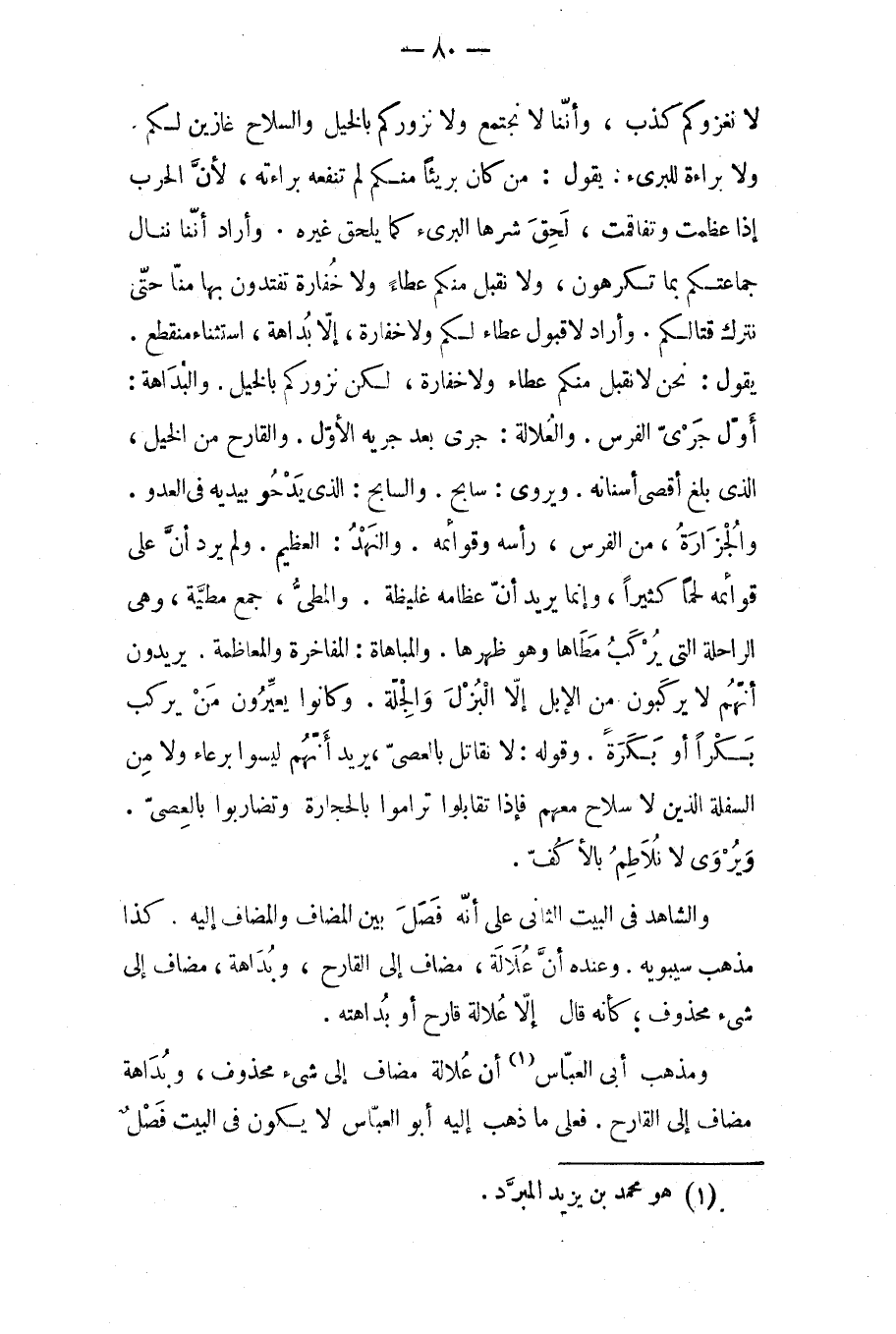 وأراد لا قبول عطاء لكم ولا خفارة، (إلا بداهة) استثناء منقطع. يقول: نحن لا نقبل منكم عطاء ولا خفارة، لكن نزوركم بالخيل. والبداهة: أول جري الفرس، والعلالة: جري بعد جريه الأول. والقارح من الخيل: الذي قد بلغ أقصى أسنانه. ويروى: سابح. والسابح: الذي يدحو بيديه في العدو، والجزارة من الفرس: رأسه وقوائمه، والنهد: العظيم، ولم يرد أن على قوائمه لحما كثيرا؛ وإنما يريد أن عظامه غليظة. والمطي: جمع مطية وهي الراحلة التي يركب مطاها: وهو ظهرها، والمباهاة: المفاخرة والمعاظمة. يريد أنهم يركبون من الإبل إلا البزل والجلة، وكانوا يعيرون من ركب بكرا. وقوله: لا نقاتل بالعصي، يريد أنهم ليسوا برعاء ولا من السفلة الذين لا سلاح معهم، فإذا تقابلوا تراموا بالحجارة وتضاربوا بالعصي.