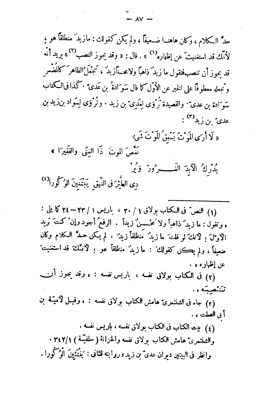 قال: وقد يجوز النصب. يريد إنه قد يجوز أن تنصب فتقول: ما زيد ذاهبا ولا محسنا زيد، تجعل الظاهر كالمضمر، وتجعله معطوفا على الخبر عن الأول. كما قال سوادة بن عدي. كذا في الكتاب: سوادة بن عدي.