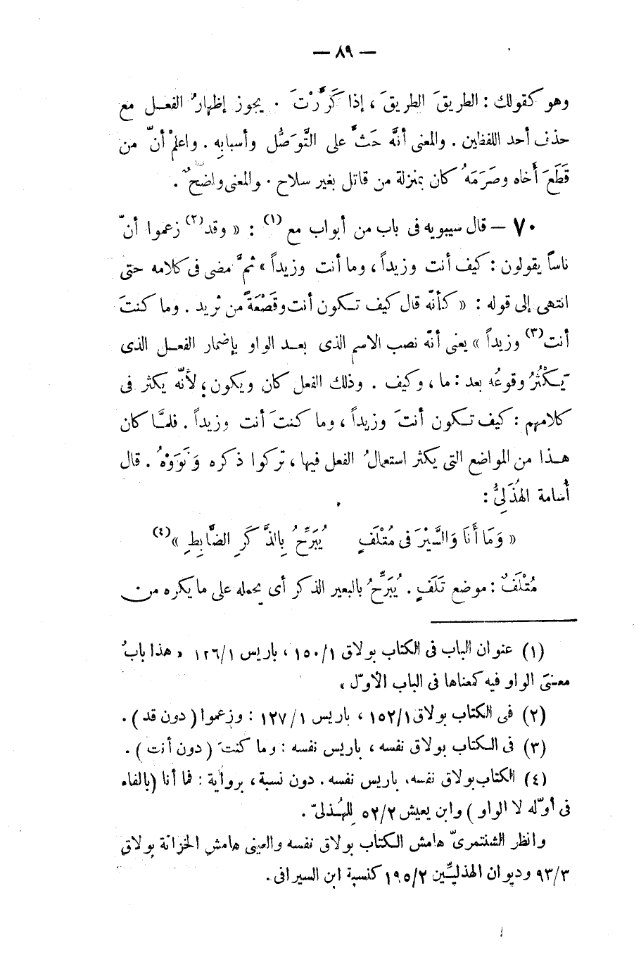 قال سيبويه في باب من أبواب (مع): وقد زعموا أن ناسا يقولون: كيف أنت وزيدا، وما أنت وزيدا. ثم مضى في كلامه حتى انتهى إلى قوله: كأنه قال: كيف تكون أنت وقصعة من ثريد، وما كنت أنت وزيدا. يعني إنه نصب الاسم الذي بعد الواو بإضمار الفعل الذي يكثر وقوعه بعد: (ما) و (كيف) وذلك الفعل (كان) و (يكون) لأنه يكثر في كلامهم: كيف تكون أنت وزيدا، وما كنت أنت وزيدا. فلما كان هذا من المواضع التي يكثر استعمال الفعل فيها، تركوا ذكره ونووه.