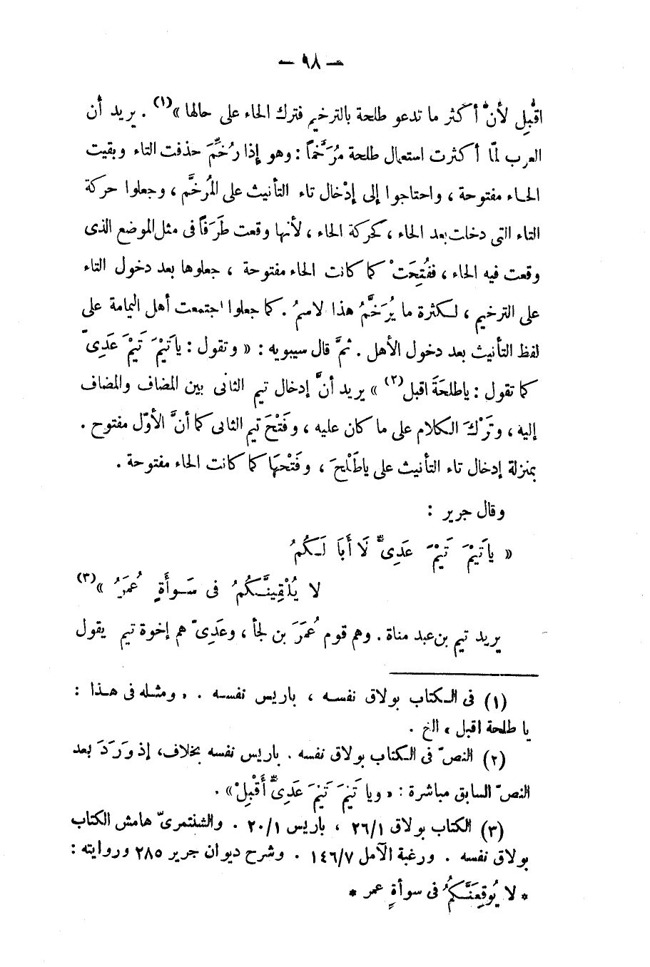 يريد أن العرب لما أكثرت استعمال طلحة مرخما، وهو إذا رخم حذفت التاء وبقيت الحاء مفتوحة، واحتاجوا إلى إدخال تاء التأنيث على المرخم، وجعلوا حركة التاء التي دخلت بعد الحاء كحركة الحاء لأنها وقعت طرفا في مثل الموضع الذي وقعت فيه الحاء؛ ففتحت كما كانت الحاء مفتوحة. جعلوها - بعد دخول التاء على الترخيم لكثرة ما يرخم هذا الاسم - كما جعلوا: (اجتمعت أهل اليمامة) على لفظ التأنيث بعد دخول (الأهل).