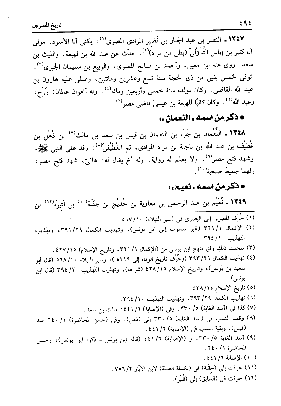 1348- النّعمان بن جزء بن النعمان بن قيس بن سعد بن مالك «7» بن ذهل بن غطيف بن عبد الله بن ناجية بن مراد المرادى، ثم الغطيفىّ «8» : وفد على النبي صلى الله عليه وسلم، وشهد فتح مصر «9» ، ولا يعلم له رواية. وله أخ يقال له: هانئ، شهد فتح مصر، ولهما جميعا صحبة «10» .