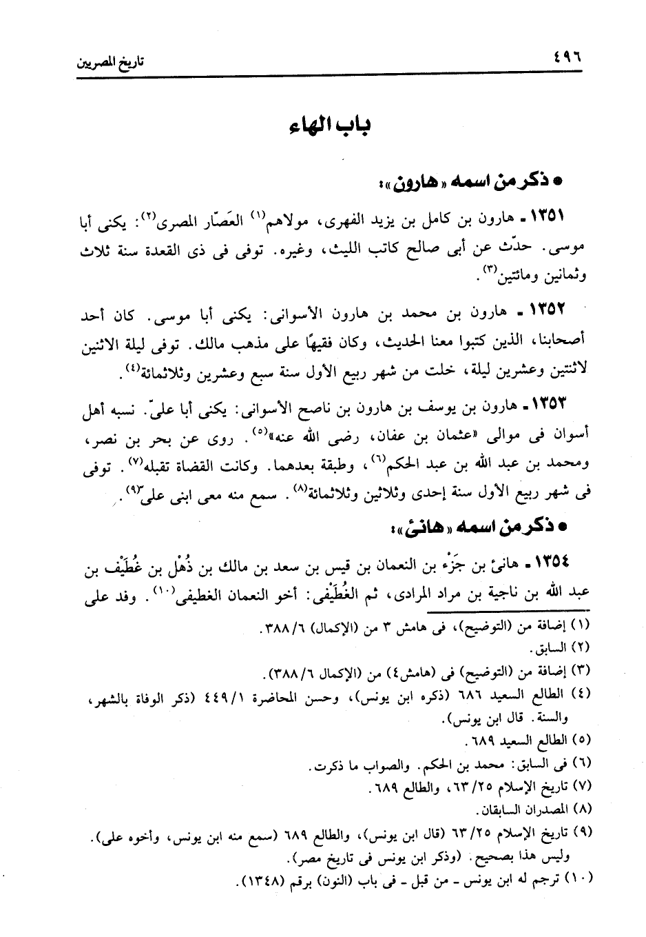 1353- هارون بن يوسف بن هارون بن ناصح الأسوانى: يكنى أبا علىّ. نسبه أهل أسوان فى موالى «عثمان بن عفان، رضى الله عنه» «5» . روى عن بحر بن نصر، ومحمد بن عبد الله بن عبد الحكم «6» ، وطبقة بعدهما. وكانت القضاة تقبله «7» . توفى فى شهر ربيع الأول سنة إحدى وثلاثين وثلاثمائة «8» . سمع منه معى ابنى علىّ «9» .