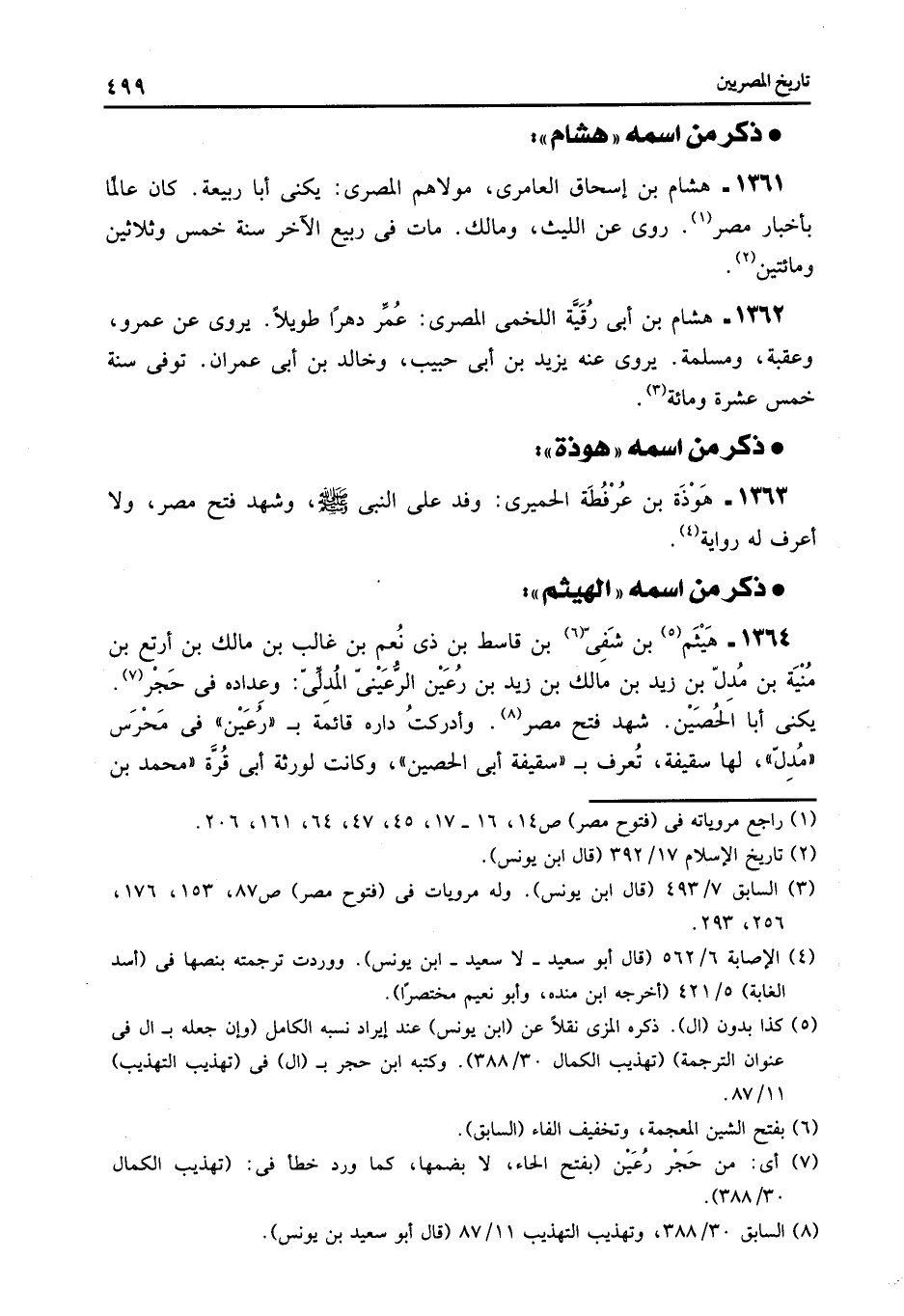 1361- هشام بن إسحاق العامرى، مولاهم المصرى: يكنى أبا ربيعة. كان عالما بأخبار مصر «1» . روى عن الليث، ومالك. مات فى ربيع الآخر سنة خمس وثلاثين ومائتين «2» .