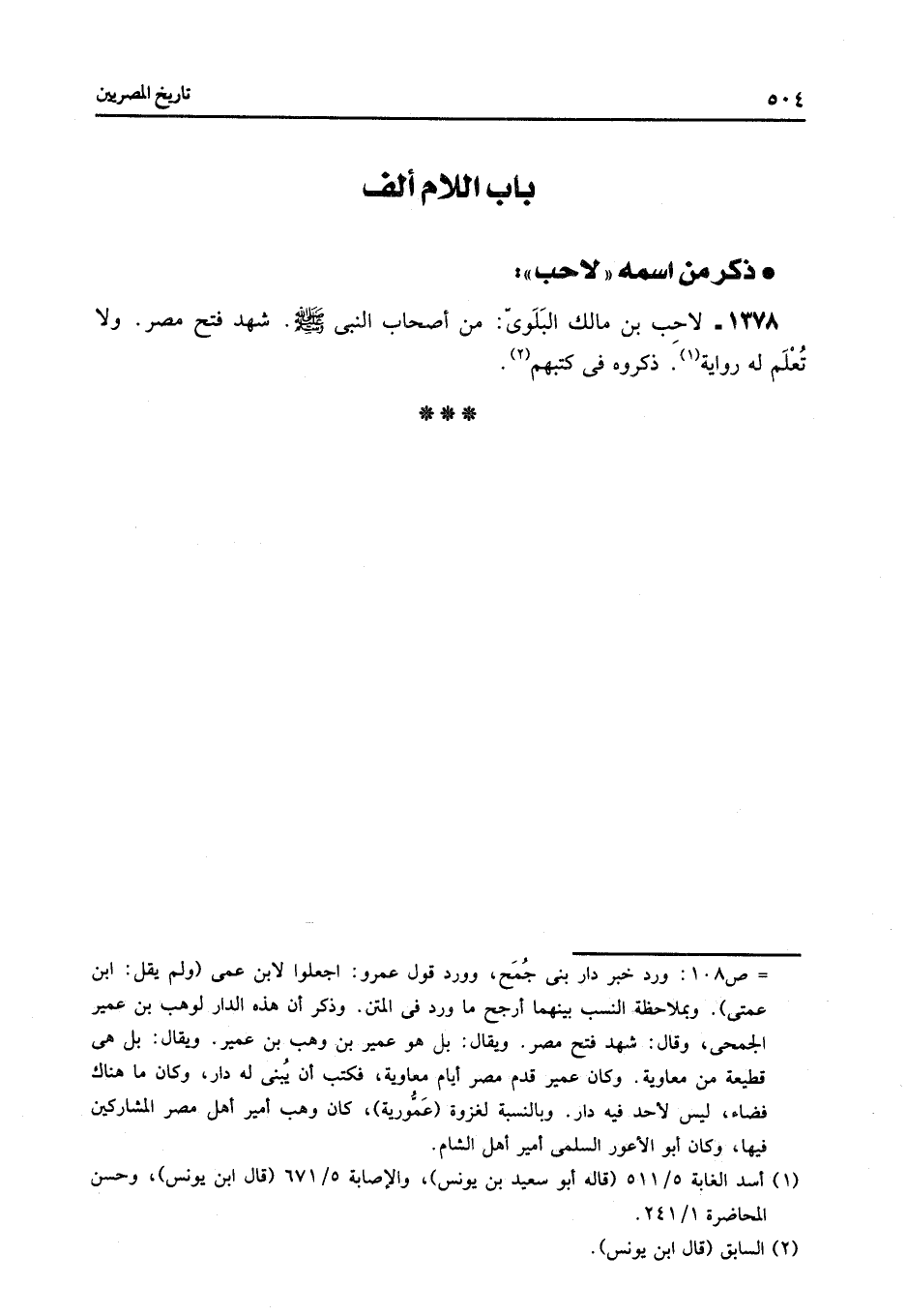 1378- لاحب بن مالك البلوىّ: من أصحاب النبي صلى الله عليه وسلم. شهد فتح مصر. ولا تعلم له رواية «1» . ذكروه فى كتبهم «2» .