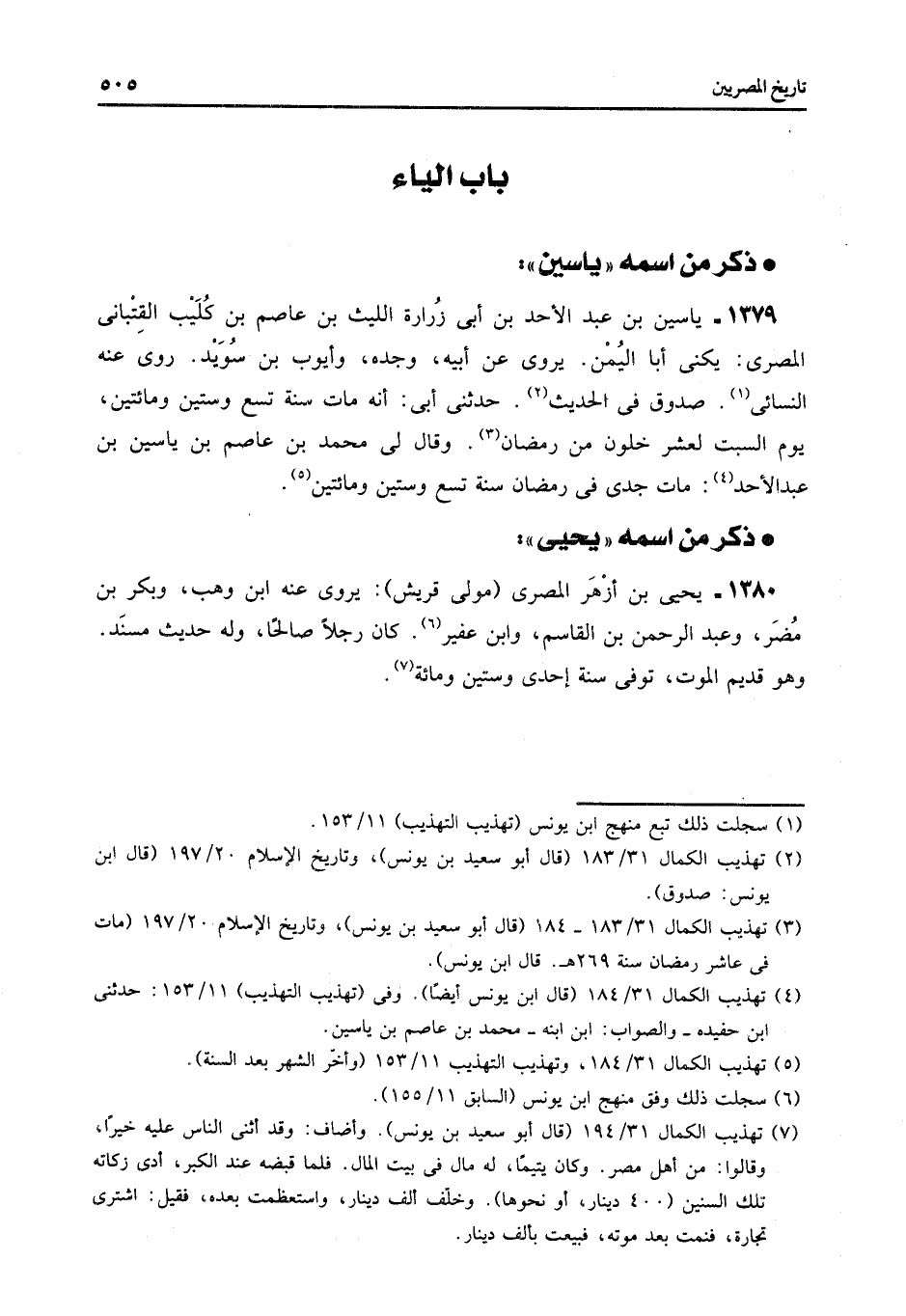 1379- ياسين بن عبد الأحد بن أبى زرارة الليث بن عاصم بن كليب القتبانى المصرى: يكنى أبا اليمن. يروى عن أبيه، وجده، وأيوب بن سويد. روى عنه النسائى «1» . صدوق فى الحديث «2» . حدثنى أبى: أنه مات سنة تسع وستين ومائتين، يوم السبت لعشر خلون من رمضان «3» . وقال لى محمد بن عاصم بن ياسين بن عبد الأحد «4» : مات جدى فى رمضان سنة تسع وستين ومائتين «5» .