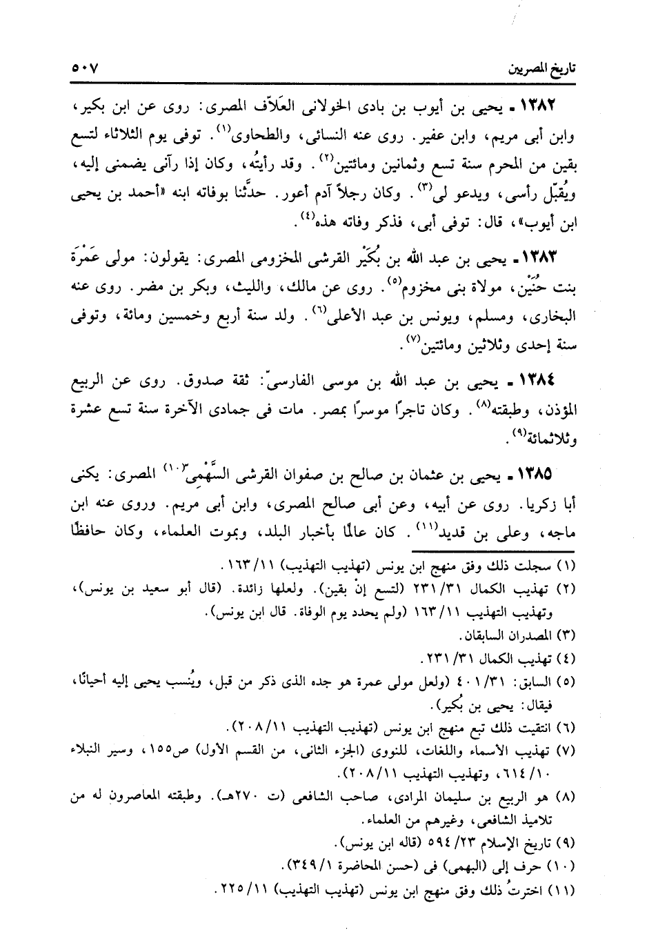 1385- يحيى بن عثمان بن صالح بن صفوان القرشى السّهمىّ «10» المصرى: يكنى أبا زكريا. روى عن أبيه، وعن أبى صالح المصرى، وابن أبى مريم. وروى عنه ابن ماجه، وعلى بن قديد «11» . كان عالما بأخبار البلد، وبموت العلماء، وكان حافظا