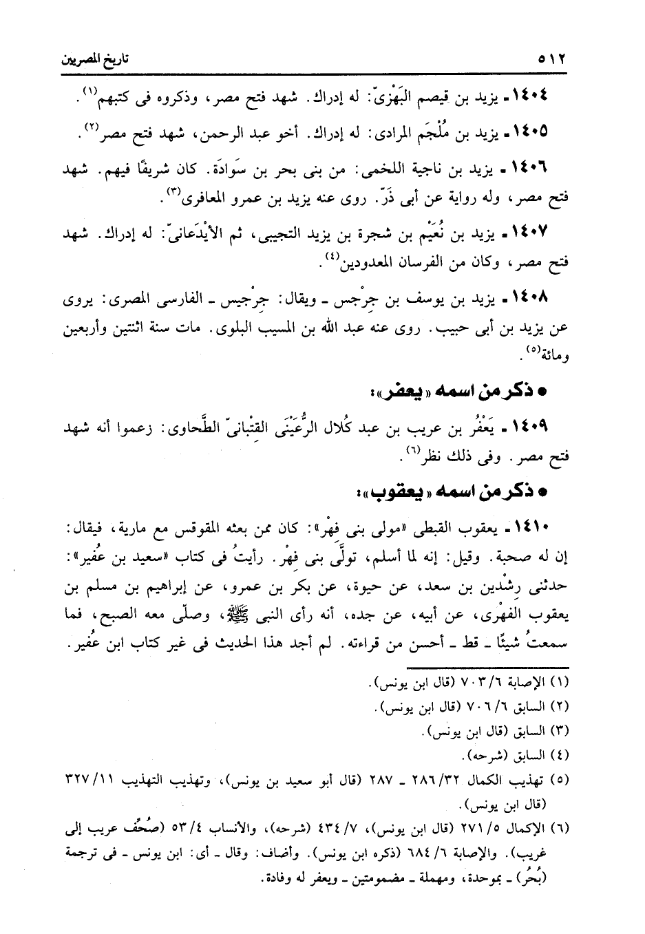1409- يعفر بن عريب بن عبد كلال الرّعينى القتبانىّ الطّحاوى: زعموا أنه شهد فتح مصر. وفى ذلك نظر «6» .