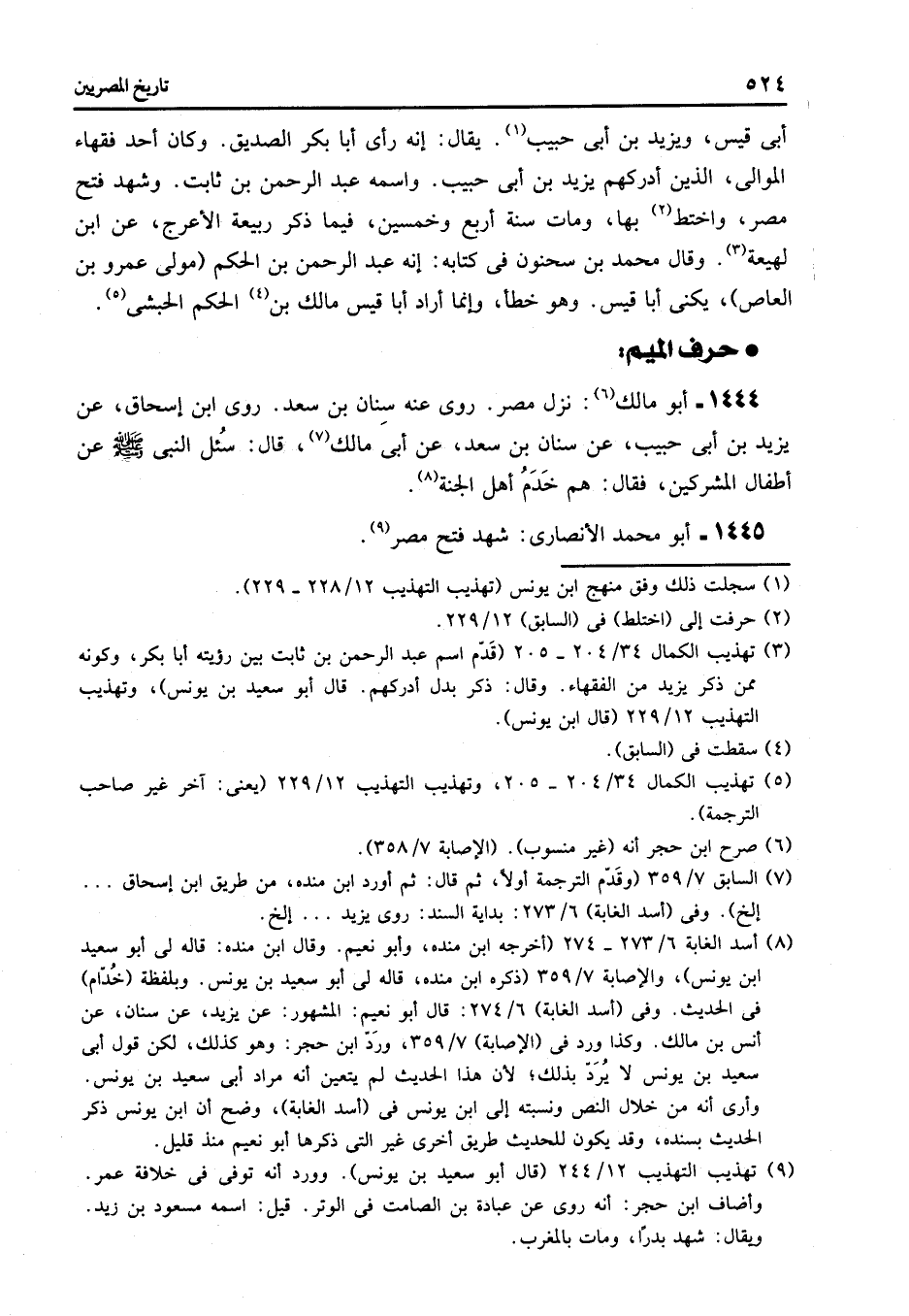 1444- أبو مالك «6» : نزل مصر. روى عنه سنان بن سعد. روى ابن إسحاق، عن يزيد بن أبى حبيب، عن سنان بن سعد، عن أبى مالك «7» ، قال: سئل النبي صلى الله عليه وسلم عن أطفال المشركين، فقال: هم خدم أهل الجنة «8» .