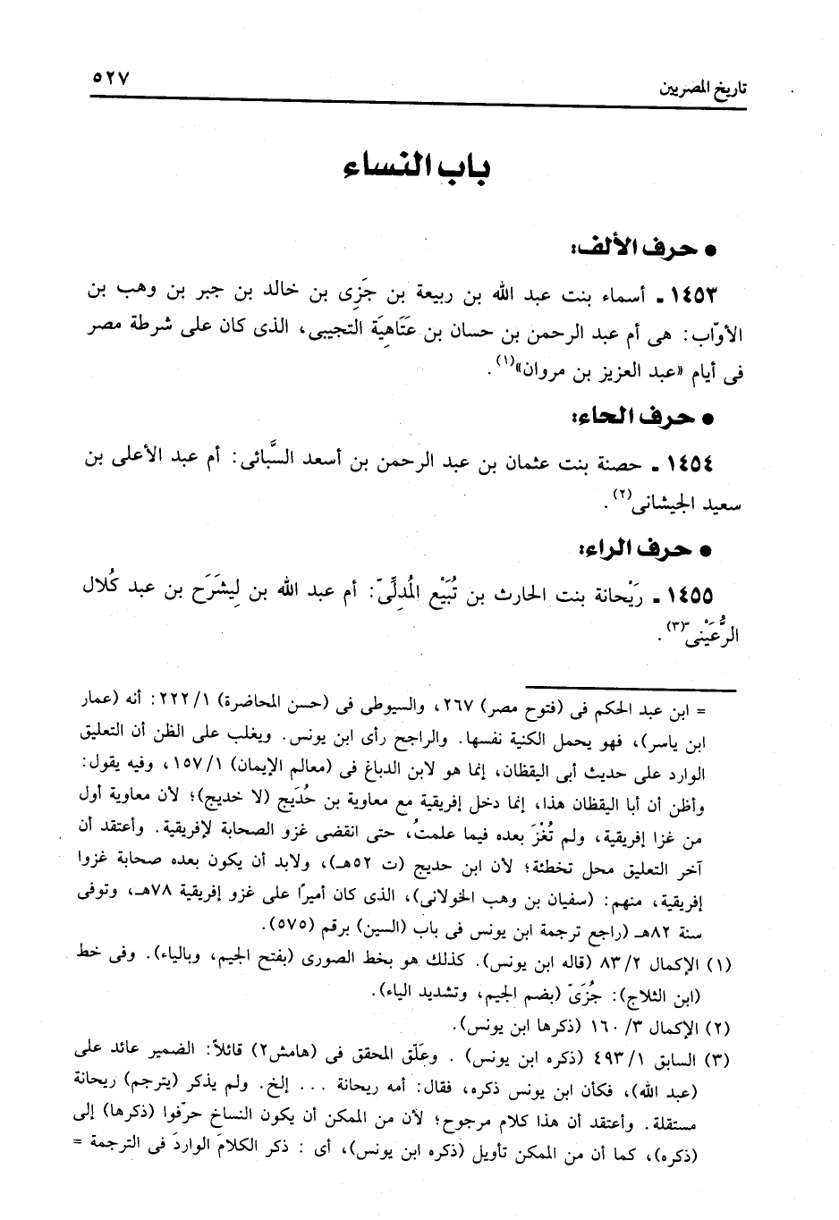 1453- أسماء بنت عبد الله بن ربيعة بن جزى بن خالد بن جبر بن وهب بن الأوّاب: هى أم عبد الرحمن بن حسان بن عتاهية التجيبى، الذي كان على شرطة مصر فى أيام «عبد العزيز بن مروان» «1» .
