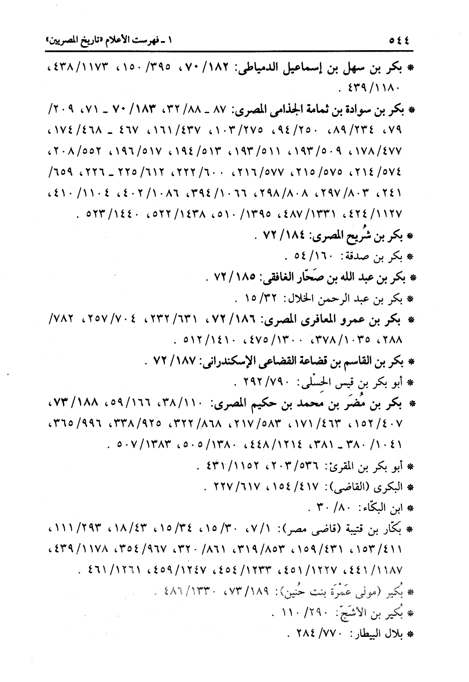 * بكر بن سوادة بن ثمامة الجذامى المصرى: 87- 88/32، 183/70- 71، 209/79، 234/89، 250/94، 275/103، 437/161، 467- 468/174، 477/178، 509/193، 511/193، 513/194، 517/196، 552/208، 574/214، 575/215، 577/216، 600/222، 612/225- 226، 659/241، 803/297، 808/298، 1066/394، 1086/402، 1104/410، 1127/424، 1331/487، 1395/510، 1438/522، 1440/523.