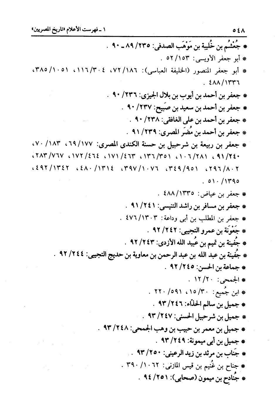 * جعفر بن ربيعة بن شرحبيل بن حسنة الكندى المصرى: 177/69، 183/70، 240/91، 281/106، 351/136، 463/171، 464/172، 767/283، 802/296، 951/349، 1076/397، 1314/480، 1342/492، 1395/510.
