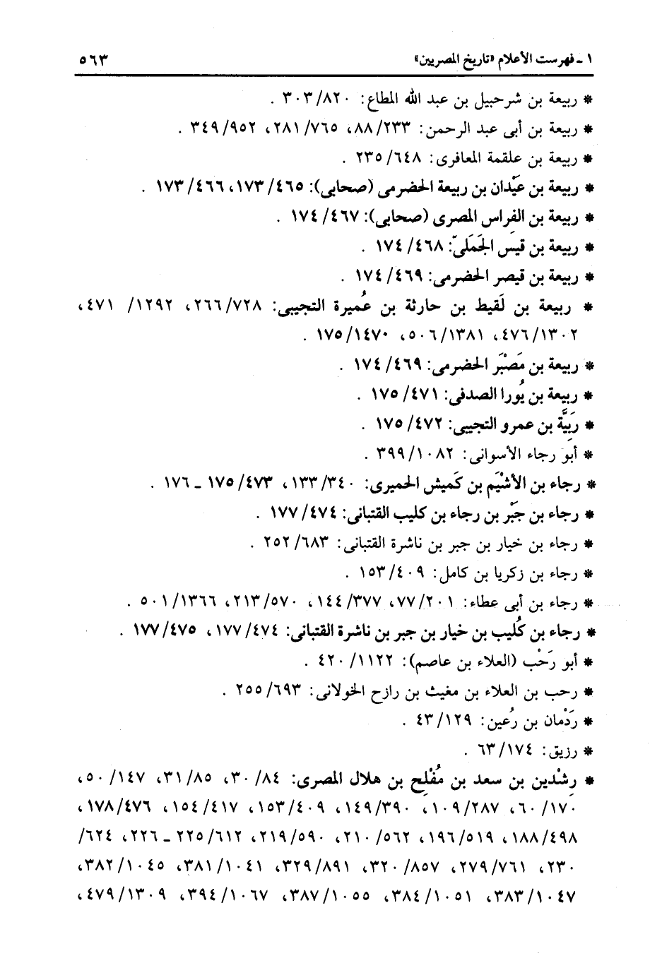 * رشدين بن سعد بن مفلح بن هلال المصرى: 84/30، 85/31، 147/50، 170/60، 287/109، 390/149، 409/153، 417/154، 476/178، 498/188، 519/196، 562/210، 590/219، 612/225- 226، 624/230، 761/279، 857/320، 891/329، 1041/381، 1045/382، 1047/383، 1051/384، 1055/387، 1067/394، 1309/479،