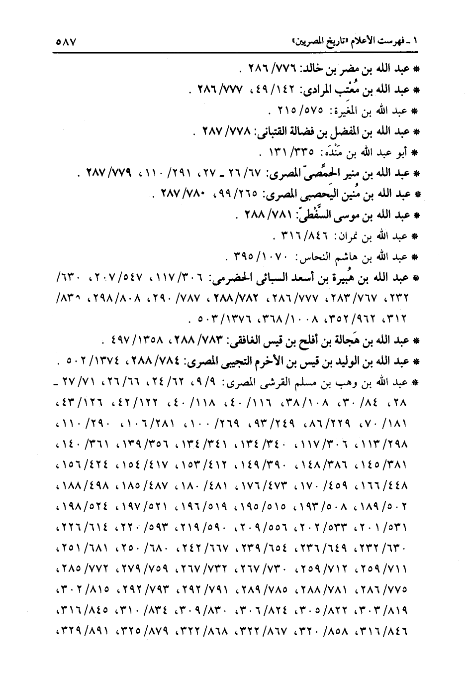 * عبد الله بن وهب بن مسلم القرشى المصرى: 9/9، 62/24، 66/26، 71/27- 28، 84/30، 108/38، 116/40، 118/40، 122/42، 126/43، 181/70، 229/86، 249/93، 269/100، 281/106، 290/110، 298/113، 306/117، 340/134، 341/134، 356/139، 361/140، 381/145، 386/148، 390/149، 412/153، 417/154، 424/156، 448/166، 459/170، 473/176، 481/180، 487/154، 424/156، 448/166، 459/170، 473/176، 481/180، 487/185، 498/188، 502/189، 508/193، 515/195، 519/197، 521/197، 524/198، 531/201، 533/202، 556/209، 590/219، 593/220، 614/226، 630/232، 649/236، 654/239، 667/242، 680/250، 681/251، 711/259، 712/259، 730/267، 732/267، 759/279، 772/285، 775/286، 781/288، 785/289، 791/292، 793/292، 815/302، 819/303، 822/305، 824/306، 830/309، 834/310، 845/316، 846/316، 858/320، 867/322، 868/322، 879/325، 891/329،