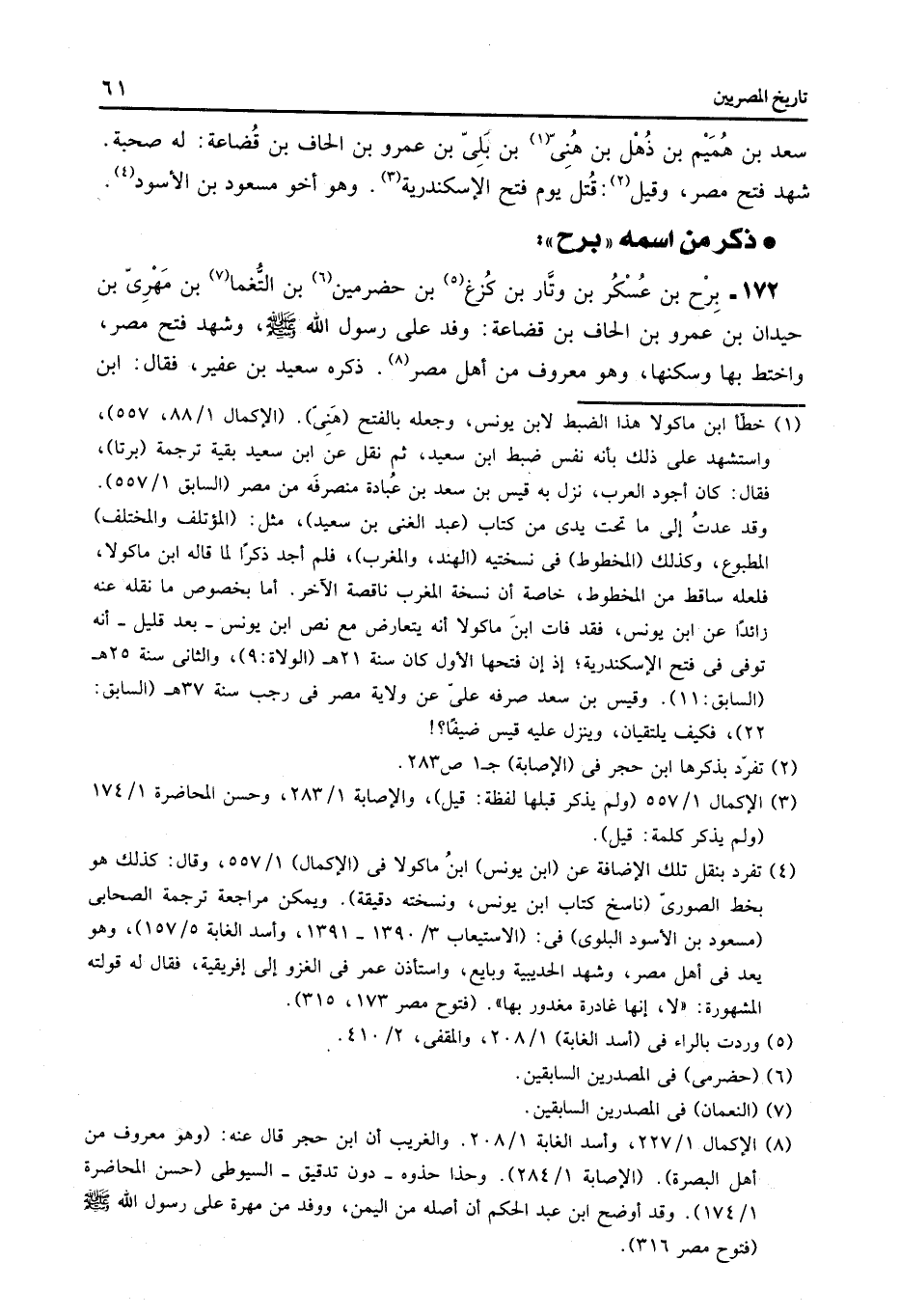 172- برح بن عسكر بن وتّار بن كزغ «5» بن حضرمين «6» بن التّغما «7» بن مهرىّ بن حيدان بن عمرو بن الحاف بن قضاعة: وفد على رسول الله صلى الله عليه وسلّم، وشهد فتح مصر، واختط بها وسكنها، وهو معروف من أهل مصر «8» . ذكره سعيد بن عفير، فقال: ابن