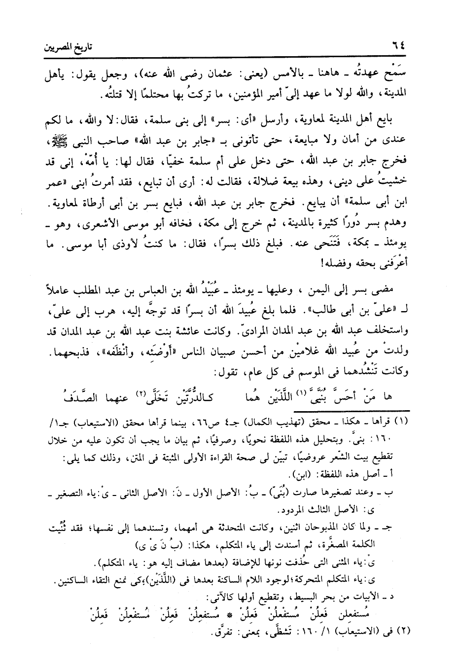 سمح عهدته- ها هنا- بالأمس (يعنى: عثمان رضى الله عنه) ، وجعل يقول: يأهل المدينة، والله لولا ما عهد إلىّ أمير المؤمنين، ما تركت بها محتلما إلا قتلته.