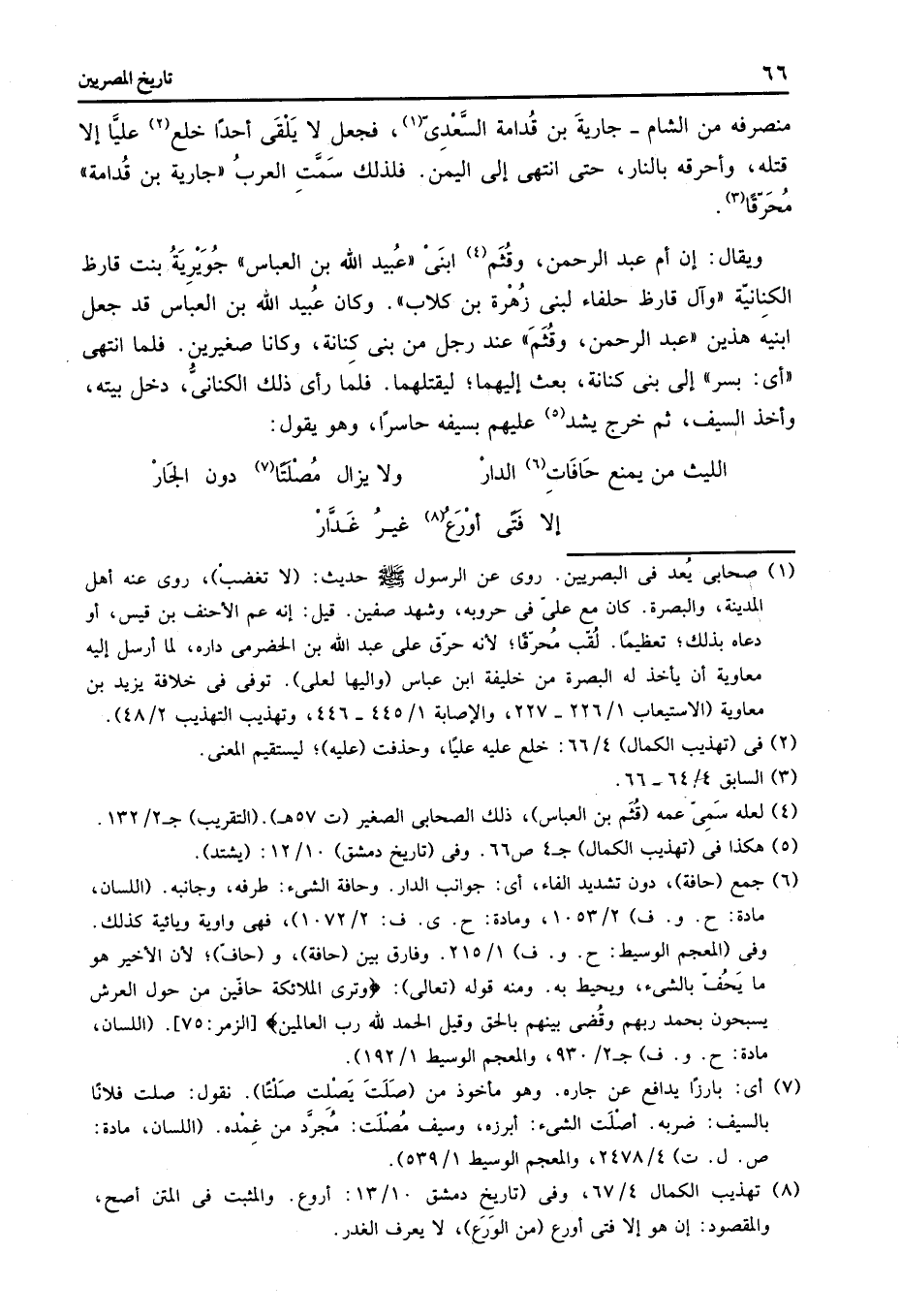 ويقال: إن أم عبد الرحمن، وقثم «4» ابنى «عبيد الله بن العباس» جويرية بنت قارظ الكنانيّة «وآل قارظ حلفاء لبنى زهرة بن كلاب» . وكان عبيد الله بن العباس قد جعل ابنيه هذين «عبد الرحمن، وقثم» عند رجل من بنى كنانة، وكانا صغيرين. فلما انتهى «أى: بسر» إلى بنى كنانة، بعث إليهما؛ ليقتلهما. فلما رأى ذلك الكنانىّ، دخل بيته، وأخذ السيف، ثم خرج يشد «5» عليهم بسيفه حاسرا، وهو يقول:
