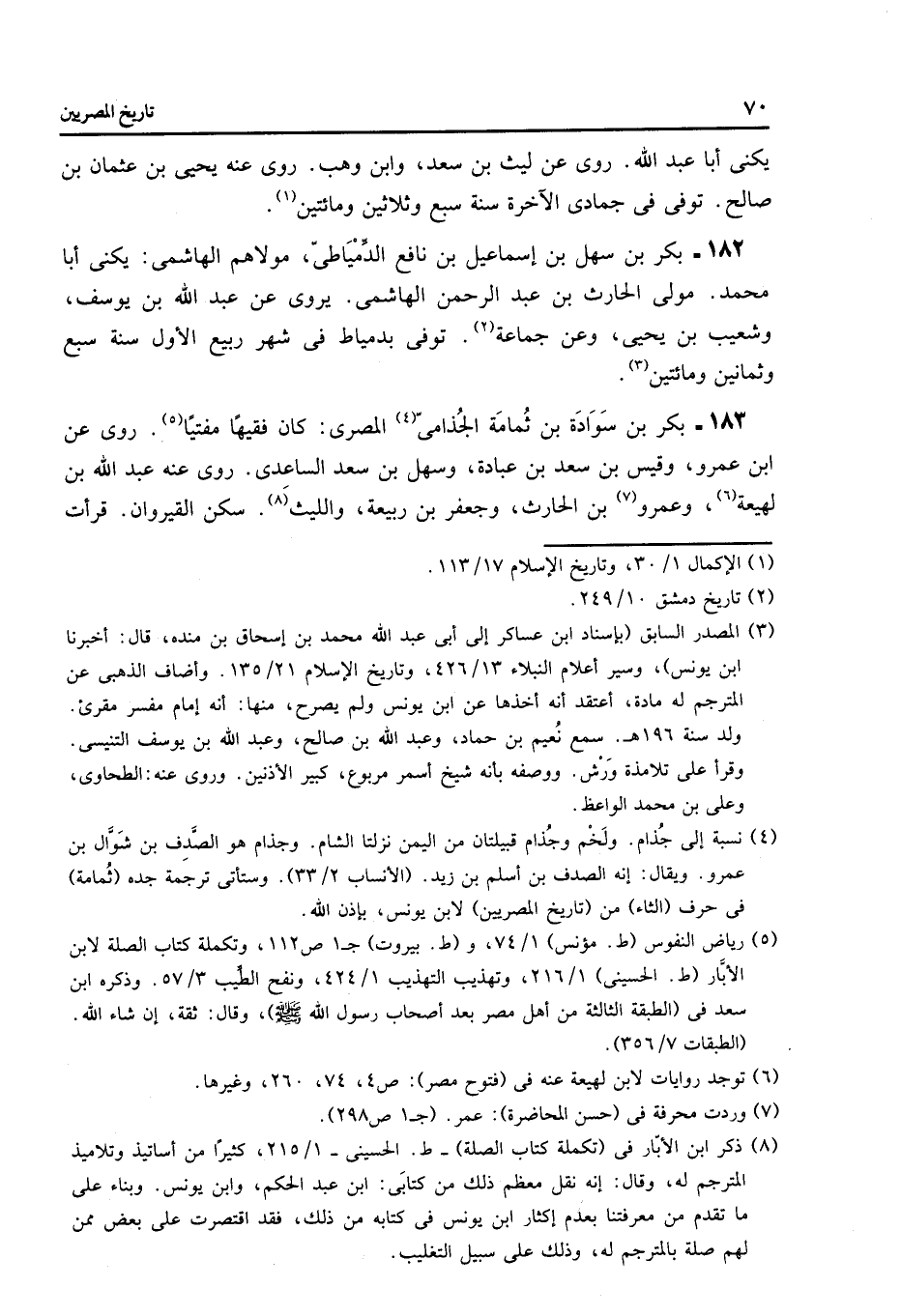 182- بكر بن سهل بن إسماعيل بن نافع الدّمياطىّ، مولاهم الهاشمى: يكنى أبا محمد. مولى الحارث بن عبد الرحمن الهاشمى. يروى عن عبد الله بن يوسف، وشعيب بن يحيى، وعن جماعة «2» . توفى بدمياط فى شهر ربيع الأول سنة سبع وثمانين ومائتين «3» .