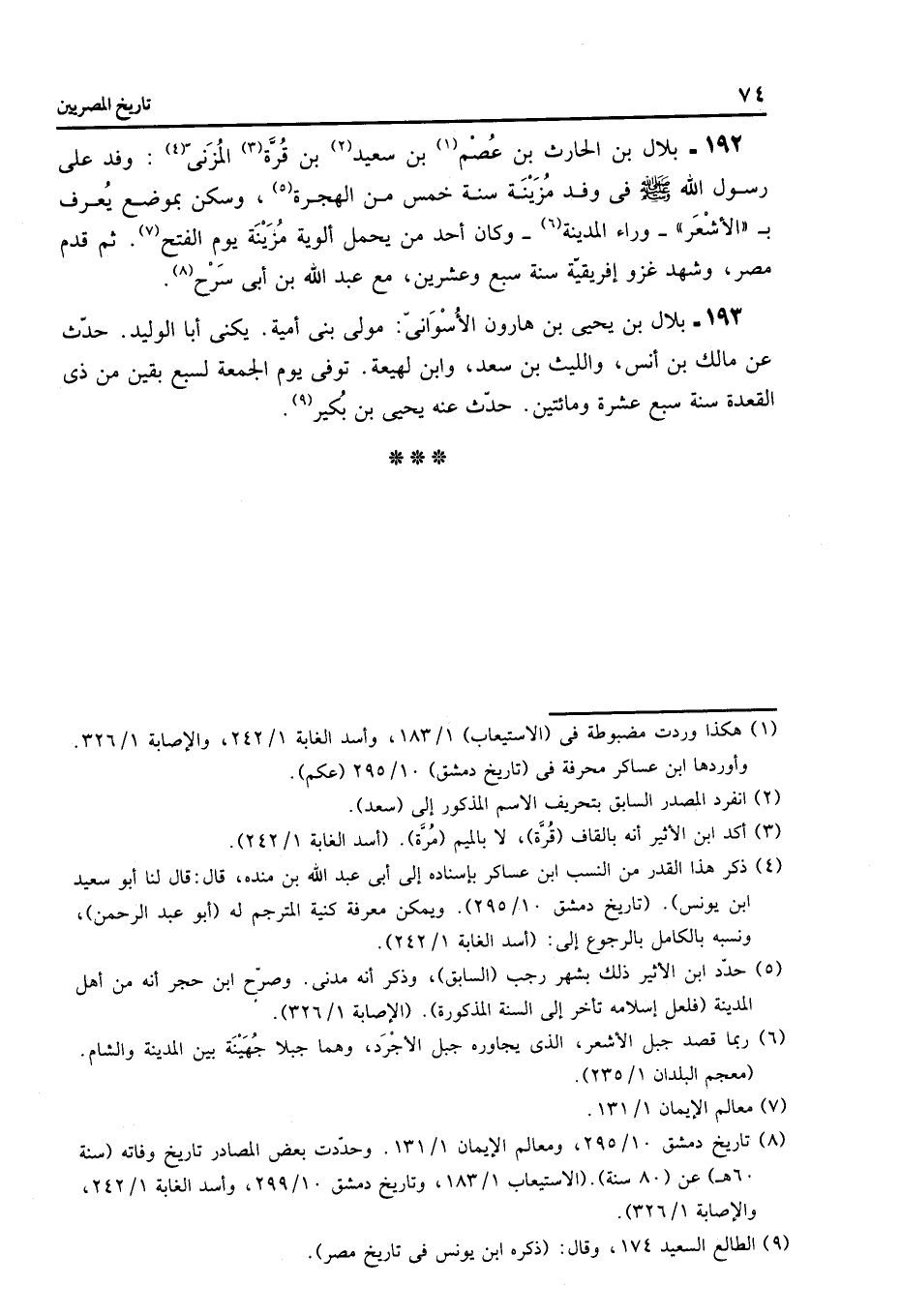192- بلال بن الحارث بن عصم «1» بن سعيد «2» بن قرّة «3» المزنىّ «4» : وفد على رسول الله صلى الله عليه وسلم فى وفد مزينة سنة خمس من الهجرة «5» ، وسكن بموضع يعرف ب «الأشعر» - وراء المدينة «6» - وكان أحد من يحمل ألوية مزينة يوم الفتح «7» . ثم قدم مصر، وشهد غزو إفريقيّة سنة سبع وعشرين، مع عبد الله بن أبى سرح «8» .