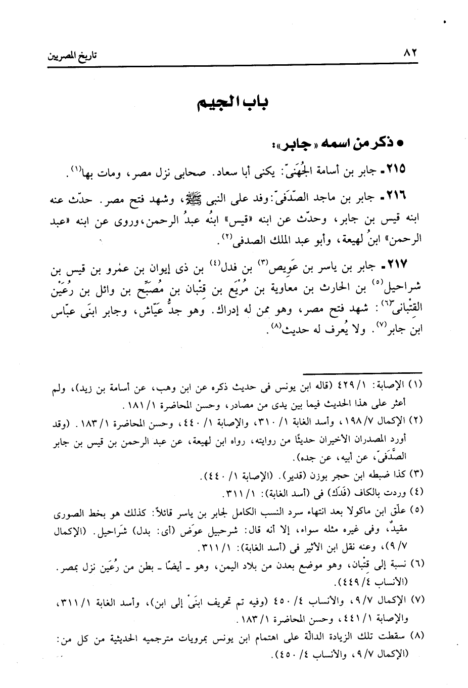 216- جابر بن ماجد الصّدفىّ: وفد على النبي صلى الله عليه وسلّم، وشهد فتح مصر. حدّث عنه ابنه قيس بن جابر، وحدّث عن ابنه «قيس» ابنه عبد الرحمن، وروى عن ابنه «عبد الرحمن» ابن لهيعة، وأبو عبد الملك الصدفى «2» .