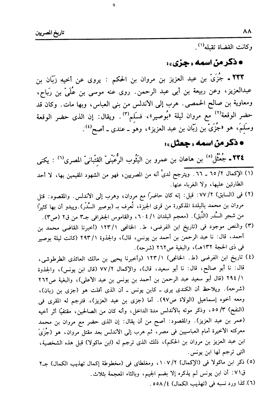233- جزىّ بن عبد العزيز بن مروان بن الحكم: يروى عن أخيه زبّان بن عبد العزيز، وعن ربيعة بن أبى عبد الرحمن. روى عنه موسى بن علىّ بن رباح، ومعاوية بن صالح الحمصى. هرب إلى الأندلس من بنى العباس، وبها مات. وكان قد حضر الوقعة «2» مع مروان ليلة «بوصير» ، فسلم «3» . ويقال: إن الذي حضر الوقعة وسلم، هو «جزىّ بن زبّان بن عبد العزيز» ، وهو- عندى- أصح» .