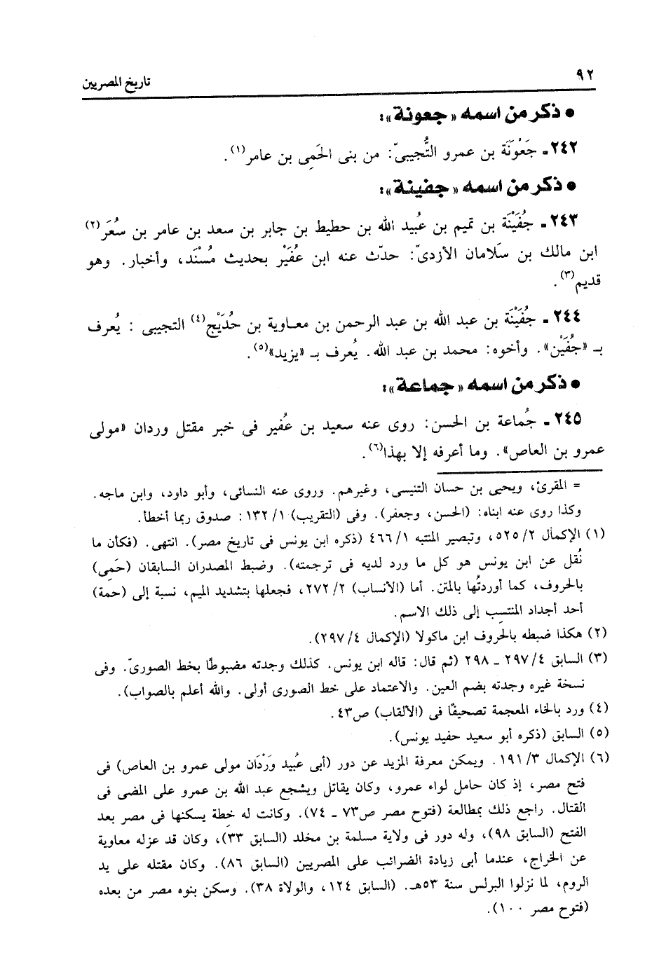 244- جفينة بن عبد الله بن عبد الرحمن بن معاوية بن حديج «4» التجيبى: يعرف ب «جفين» . وأخوه: محمد بن عبد الله. يعرف ب «يزيد» «5» .