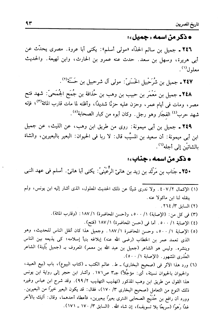 248- جميل بن معمر بن حبيب بن وهب بن حذافة بن جمح الجمحىّ: شهد فتح مصر، ومات فى أيام عمر، وحزن عليه حزنا شديدا، وأظنه لما مات قارب المائة «3» ؛ فإنه شهد حرب «4» الفجار وهو رجل. وكان أبوه من كبار الصحابة «5» .