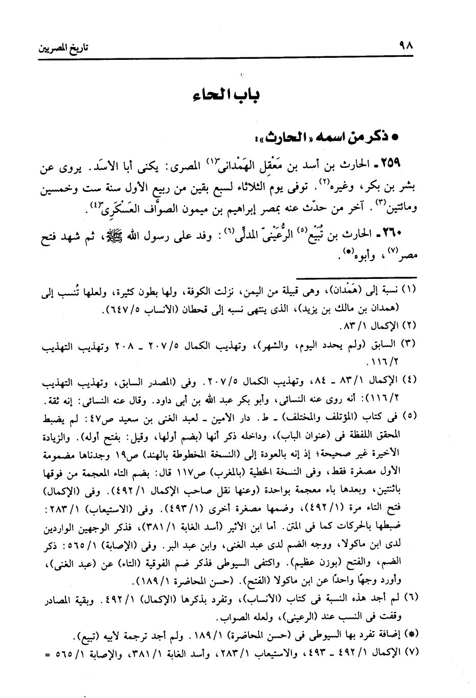259- الحارث بن أسد بن معقل الهمدانىّ «1» المصرى: يكنى أبا الأسد. يروى عن بشر بن بكر، وغيره «2» . توفى يوم الثلاثاء لسبع بقين من ربيع الأول سنة ست وخمسين ومائتين «3» . آخر من حدّث عنه بمصر إبراهيم بن ميمون الصوّاف العسكرىّ «4» .