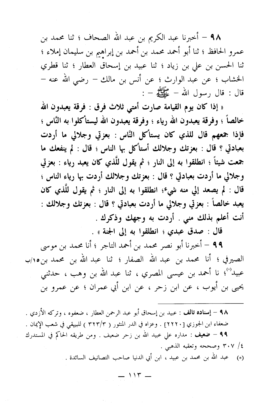 98- أخبرنا عبد الكريم بن عبد الله الصحاف؛ ثنا محمد بن عمرو الحافظ؛ ثنا أبو أحمد محمد بن أحمد بن إبراهيم بن سليمان إملاء؛ ثنا الحسن بن علي بن زياد؛ ثنا عبيد بن إسحاق العطار؛ ثنا قطري الخشاب؛ عن عبد الوارث؛ عن أنس بن مالك –رضي الله عنه- قال: قال رسول الله صلى الله عليه وسلم: