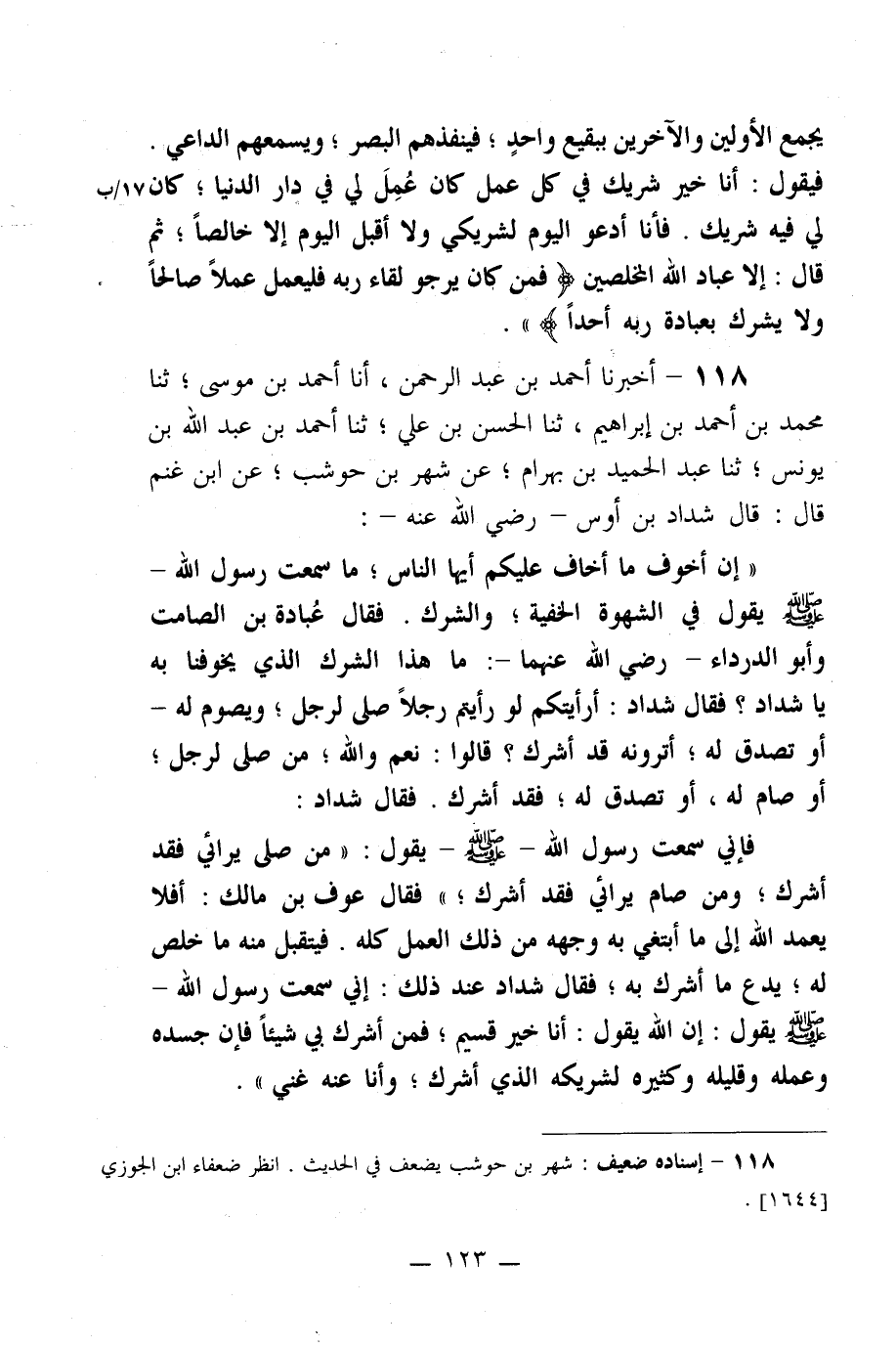 118- أخبرنا أحمد بن عبد الرحمن، أنا أحمد بن موسى؛ ثنا محمد بن أحمد بن إبراهيم، ثنا الحسن بن علي؛ ثنا أحمد بن عبد الله بن يونس؛ ثنا عبد الحميد بن بهرام؛ عن شهر بن حوشب؛ عن ابن غنم قال: قال شداد بن أوس –رضي الله عنه-: