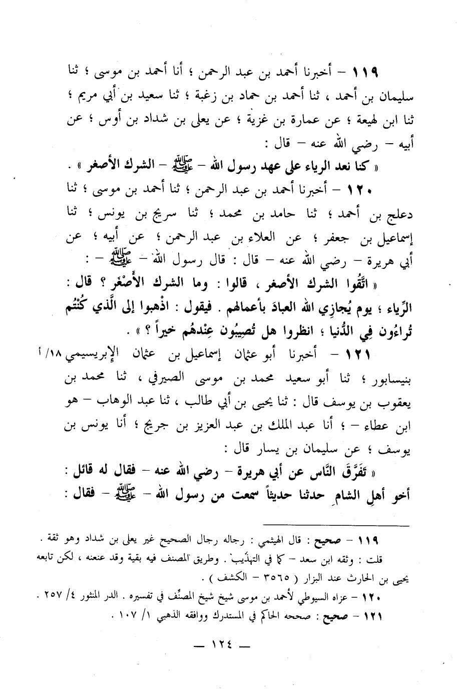 119- أخبرنا أحمد بن عبد الرحمن؛ أنا أحمد بن موسى؛ ثنا سليمان بن أحمد، ثنا أحمد بن حماد بن زغبة؛ ثنا سعيد بن أبي مريم؛ ثنا ابن لهيعة؛ عن عمارة بن غزية؛ عن يعلى بن شداد بن أوس؛ عن أبيه –رضي الله عنه- قال: