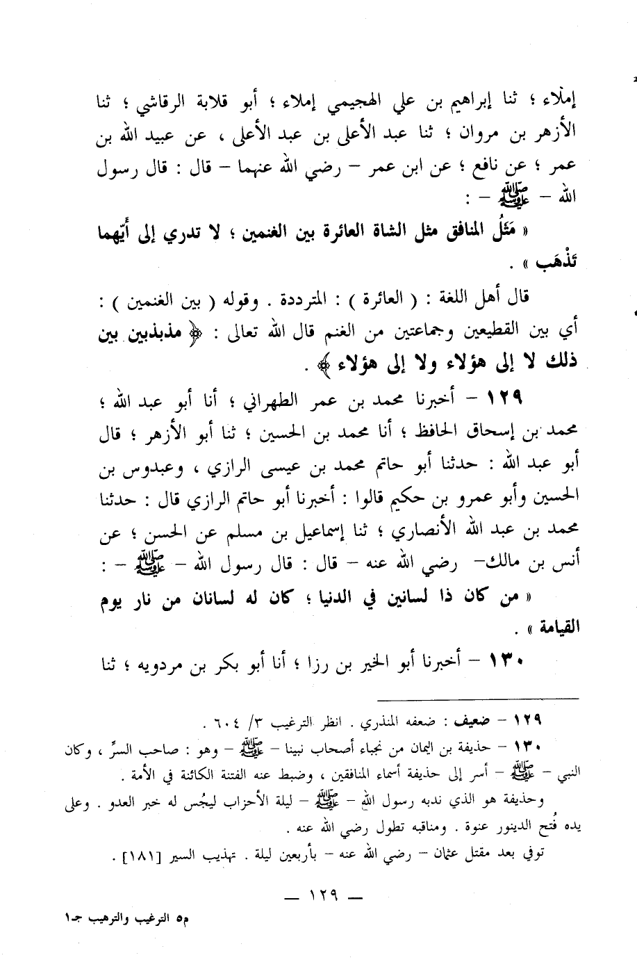 129- أخبرنا محمد بن عمر الطهراني؛ أنا أبو عبد الله؛ محمد بن إسحاق الحافظ؛ أنا محمد بن الحسين؛ ثنا أبو الأزهر؛ قال أبو عبد الله: حدثنا أبو حاتم محمد بن عيسى الرازي، وعبدوس بن الحسين وأبو عمرو بن حكيم قالوا: أخبرنا أبو حاتم الرازي قال: حدثنا محمد بن عبد الله الأنصاري؛ ثنا إسماعيل بن مسلم عن الحسن؛ عن أنس بن مالك –رضي الله عنه- قال: قال رسول الله صلى الله عليه وسلم: