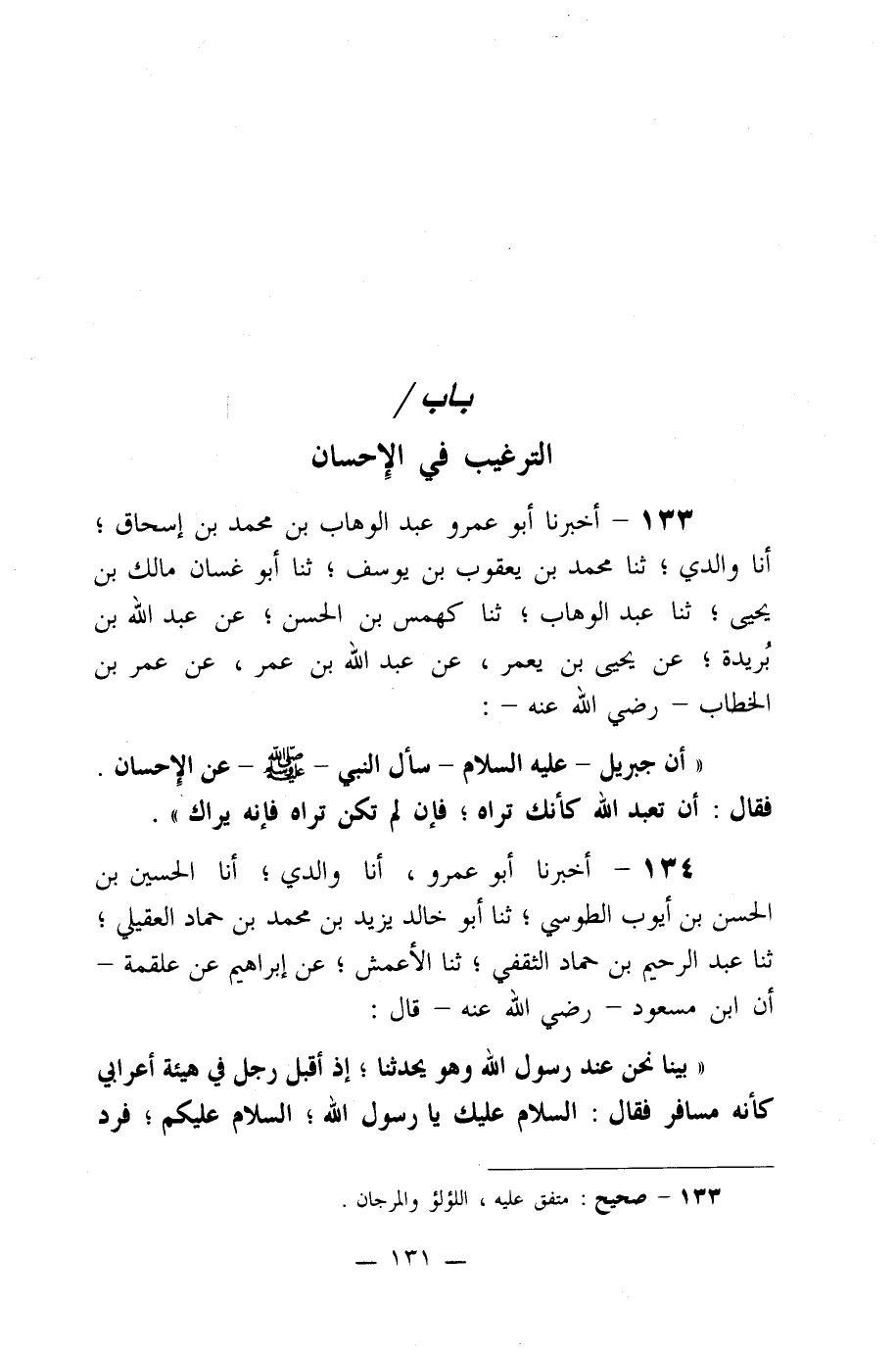 ((بينا نحن عند رسول الله وهو يحدثنا؛ إذ أقبل رجل في هيئة أعرابي كأنه مسافر فقال: السلام عليك يا رسول الله؛ السلام عليكم؛ فرد -[132]- رسول الله صلى الله عليه وسلم ورددنا عليه. فقال: أدنو منك يا رسول الله؟ فقال له: نعم. فدنا رتوة أو رتوتين. حتى وضع يده على ركبتي رسول الله صلى الله عليه وسلم ثم قال: يا رسول الله؛ أخبرني عن الإيمان قال: أن تؤمن بالله وملائكته وكتبه ورسله واليوم الآخر والقدر خيره وشره. قال: صدقت – فتعجبنا من قوله: ((صدقت)) . كأنه قد علم ذلك – ثم قال: ما الإسلام؟ قال: إقام الصلاة؛ وإيتاء الزكاة؛ وحج البيت إن استطعت إليه سبيلاً؛ وصيام شهر رمضان؛ والاغتسال من الجنابة. قال: صدقت -فتعجنا من قوله: ((صدقت)) كأنه قد علم ذلك- قال: فأخبرني عن الإحسان ما هو؟ قال: